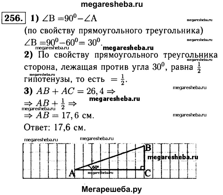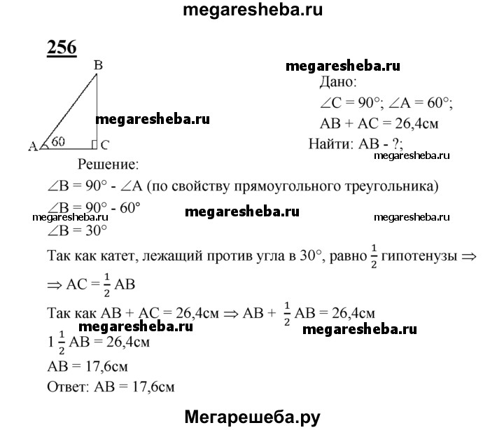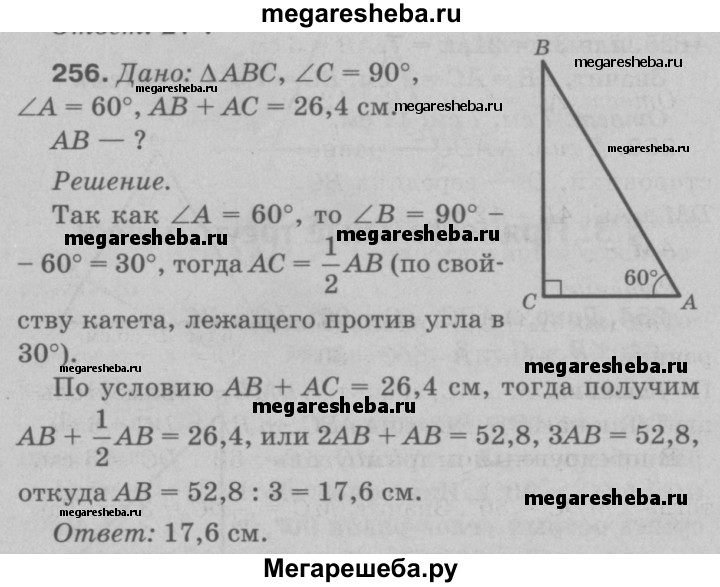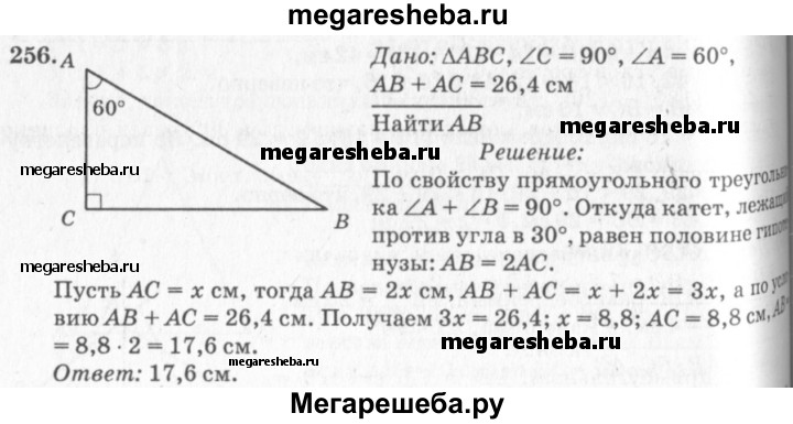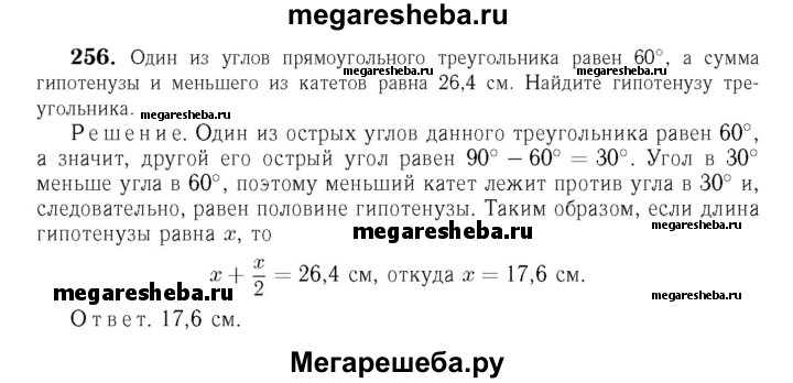 256 Один из углов прямоугольного треугольника равен 60°, а сумма гипотенузы и меньшего из катетов равна 26,4 см. Найдите гипотенузу треугольника.