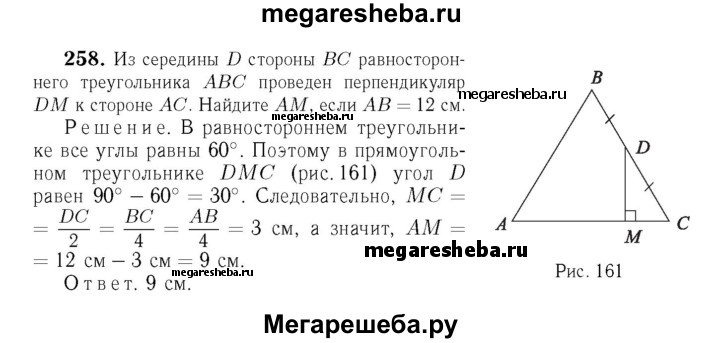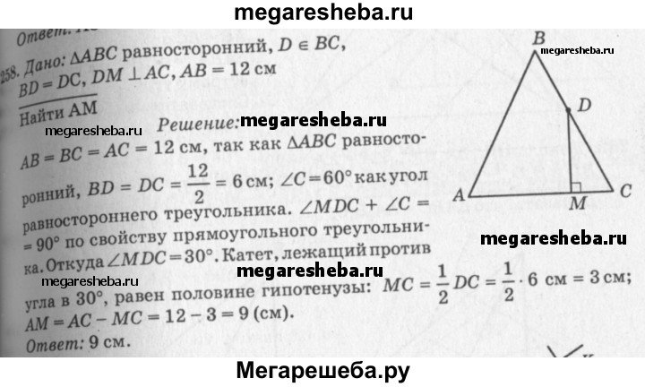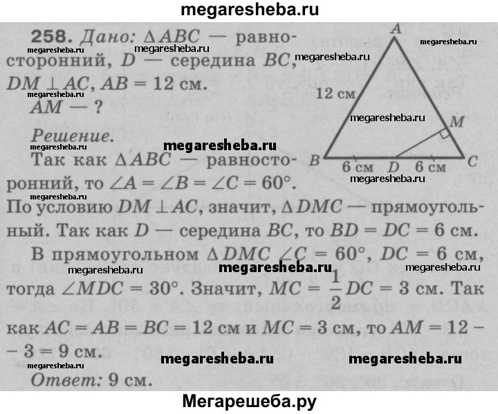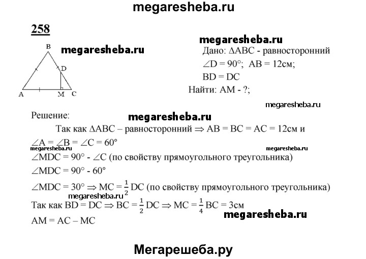 258 Из середины D стороны ВС равностороннего треугольника ABC проведён перпендикуляр DM к прямой АС. Найдите AM, если АВ = 12 см.