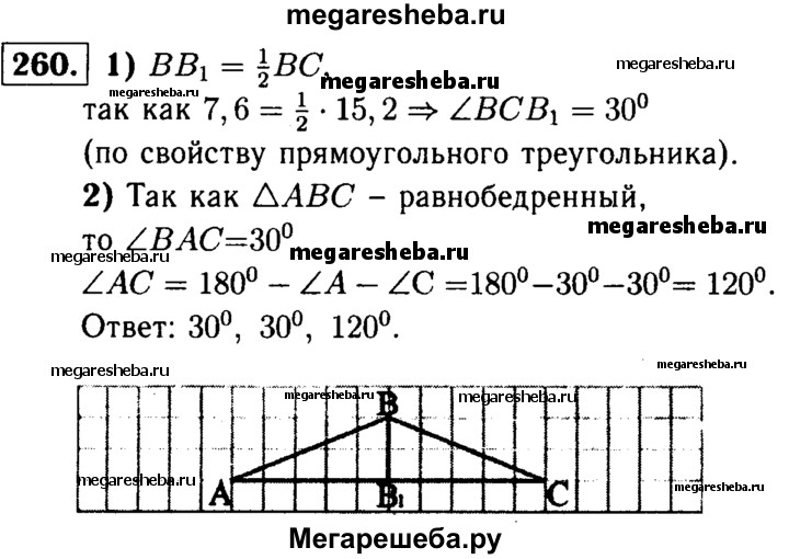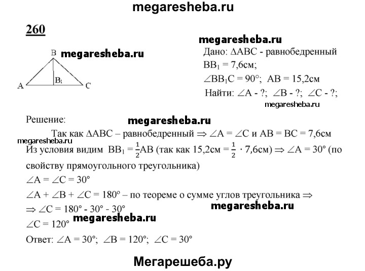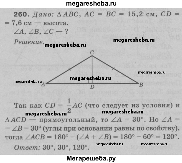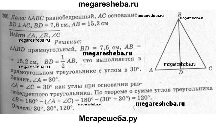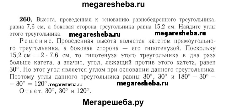 260 Высота, проведённая к основанию равнобедренного треугольника, равна 7,6 см, а боковая сторона треугольника равна 15,2 см. Найдите углы этого треугольника.