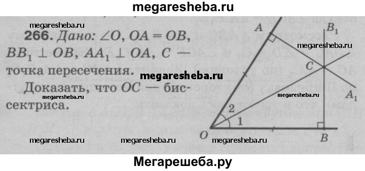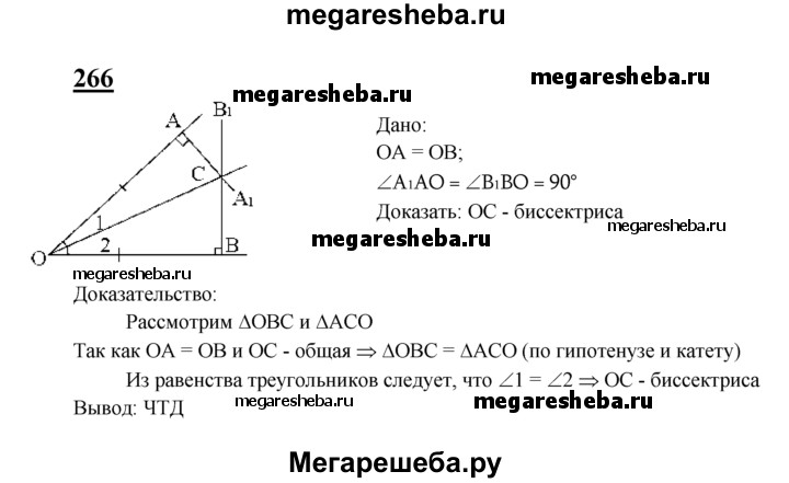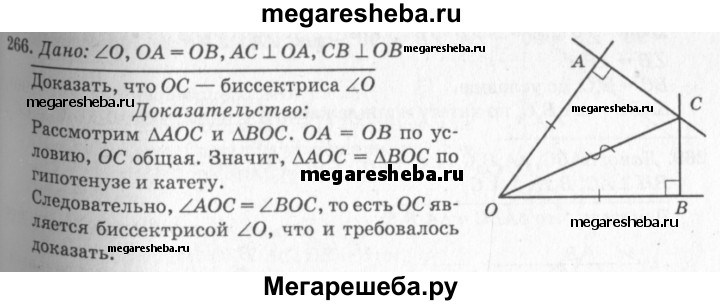 266 На сторонах угла О отмечены точки А и В так, что ОА = ОВ. Через эти точки проведены прямые, перпендикулярные к сторонам угла и пересекающиеся в точке С. Докажите, что луч ОС — биссектриса угла О.