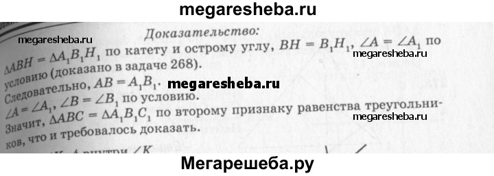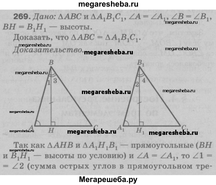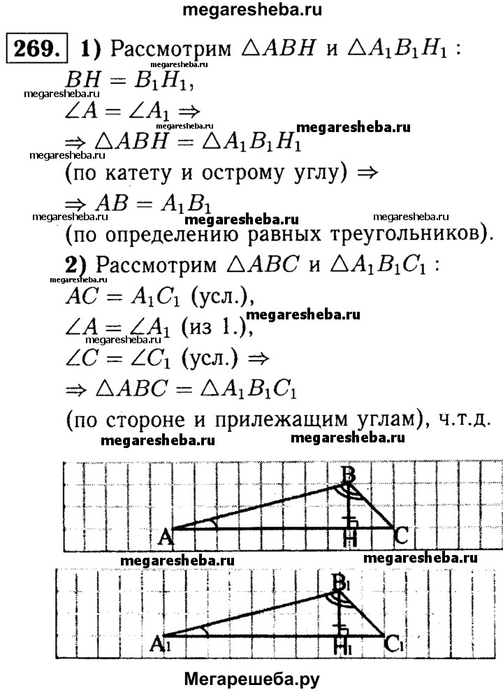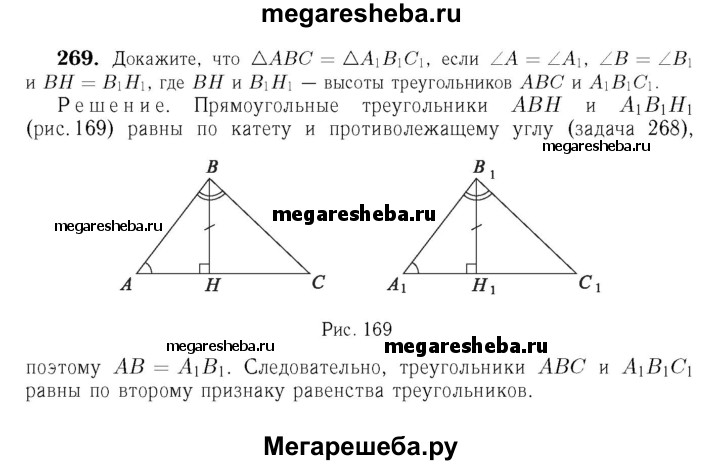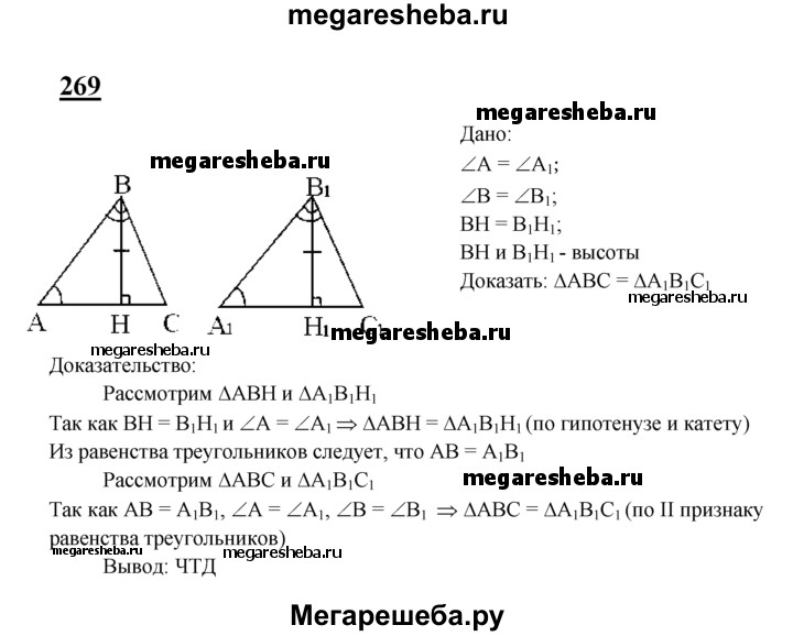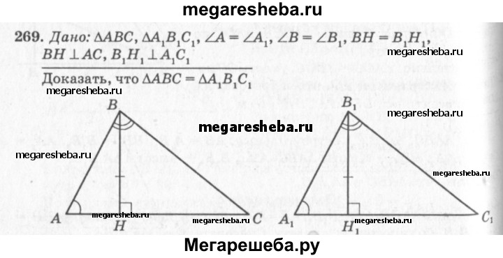 269 Докажите, что ЛАВС = ЛА1В1С1, если ∠A = ∠AU ∠B = ∠B1 и ВН = В1Н1, где ВН и В1Н1 — высоты ΔАВС и ΔА1В1С1.