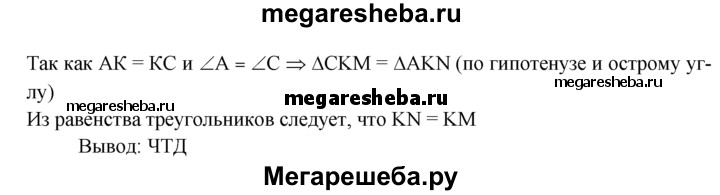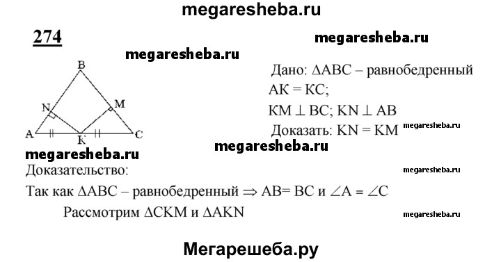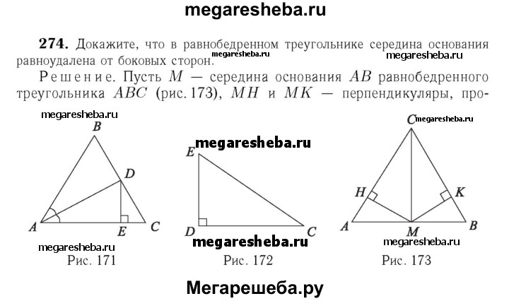 274 Докажите, что в равнобедренном треугольнике середина основания равноудалена от боковых сторон.