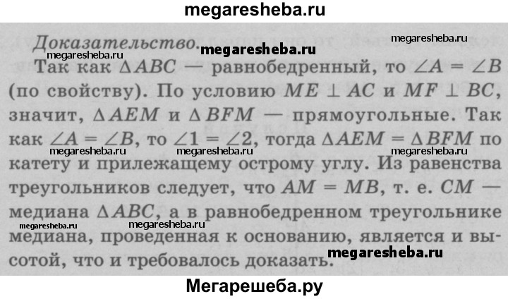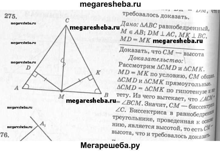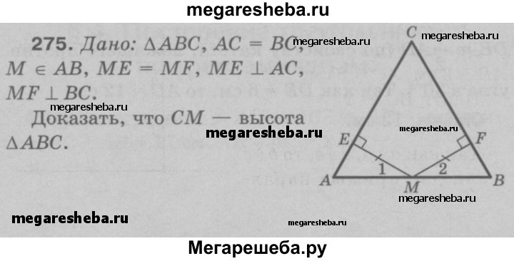 275 На основании АВ равнобедренного треугольника ABC взята точка М, равноудалённая от боковых сторон. Докажите, что СМ — высота треугольника ABC.