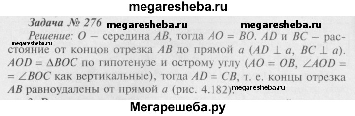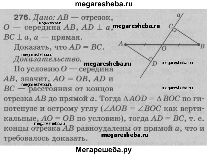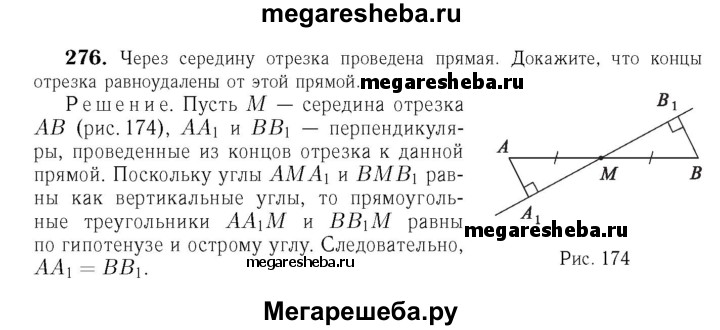 276 Через середину отрезка проведена прямая. Докажите, что концы отрезка равноудалены от этой прямой.
