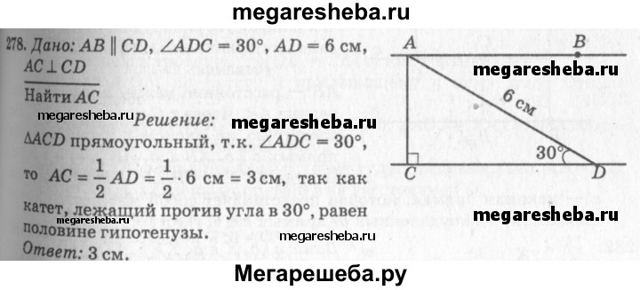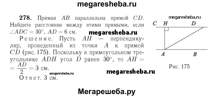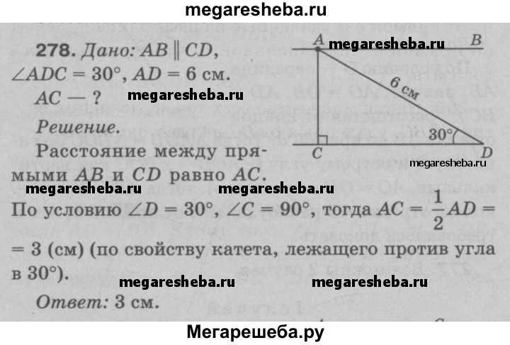 278 В Прямая АВ параллельна прямой CD. Найдите расстояние между этими прямыми, если ∠ADC = 30°, AD - 6 см.