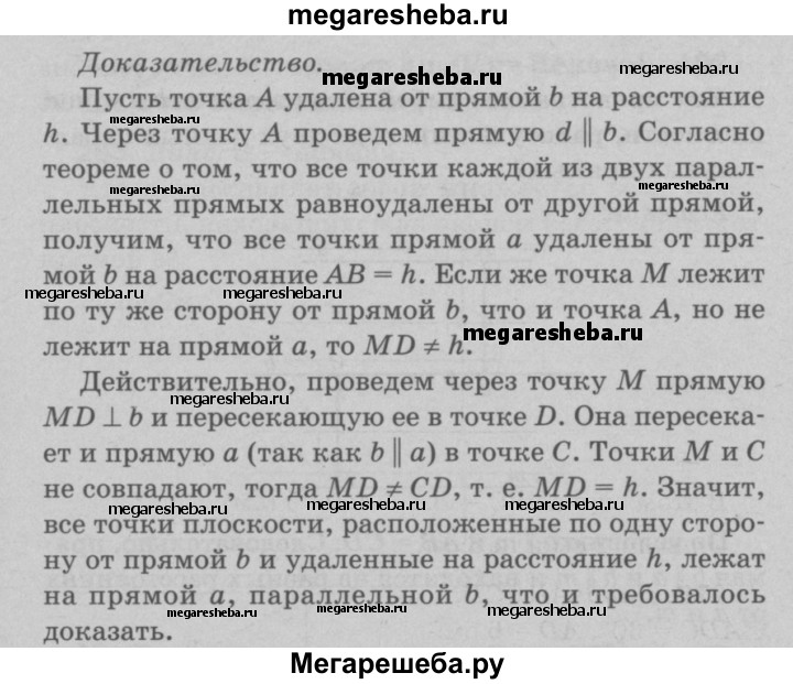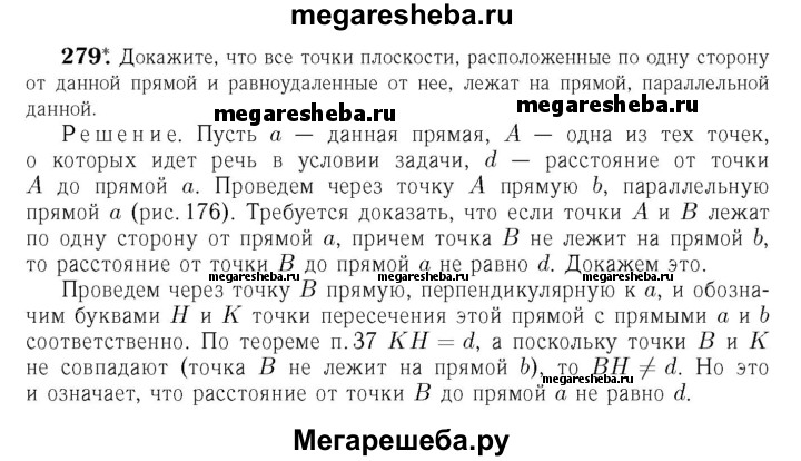 279* Докажите, что все точки плоскости, расположенные по одну сторону от данной прямой и равноудалённые от неё, лежат на прямой, параллельной данной.