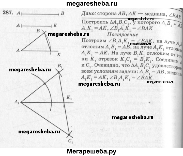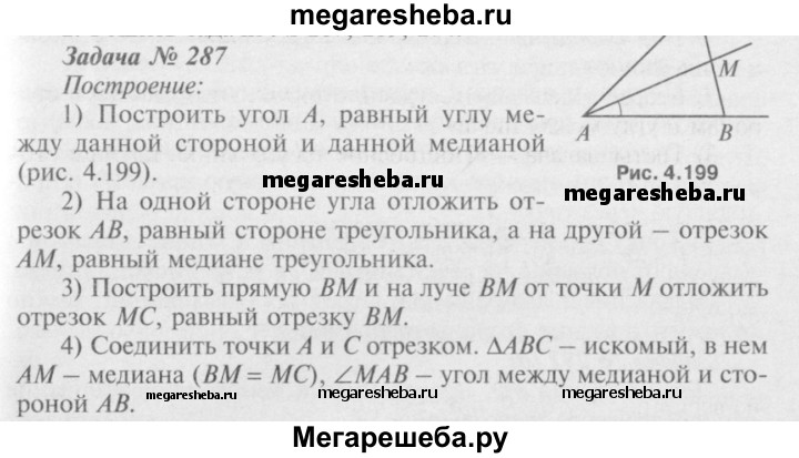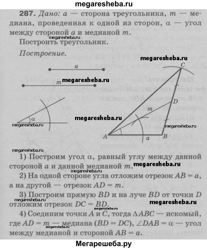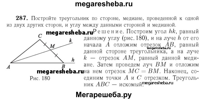 287 Постройте треугольник по стороне, медиане, проведённой к одной из двух других сторон, и углу между данными стороной и медианой.