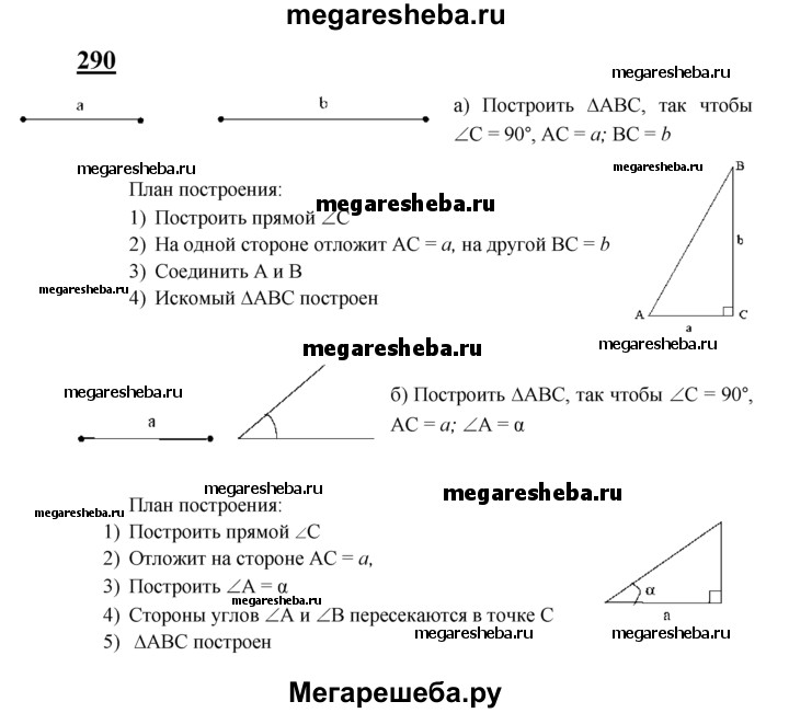 290 Постройте прямоугольный треугольник: а) по двум катетам; б) по катету и прилежащему к нему острому углу.