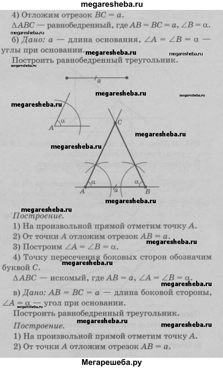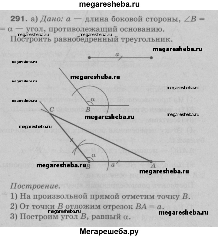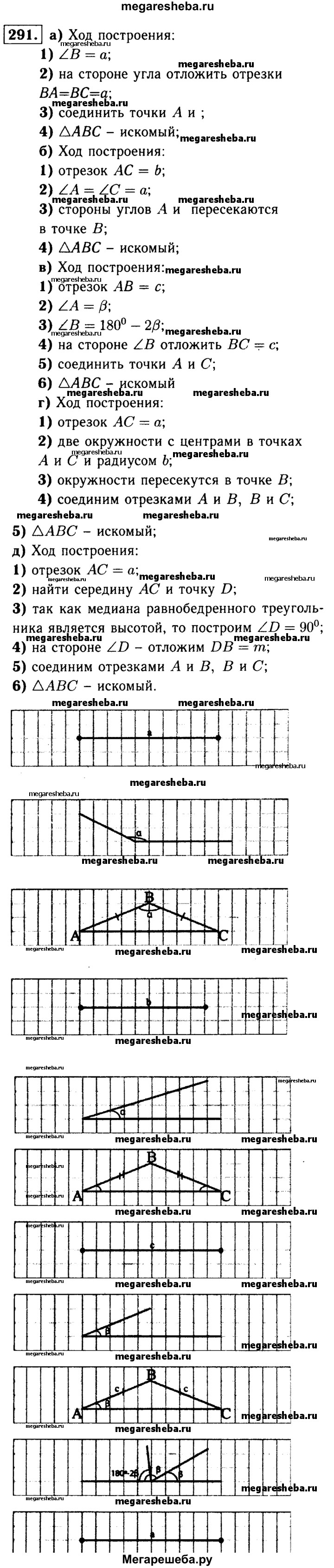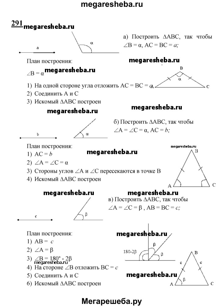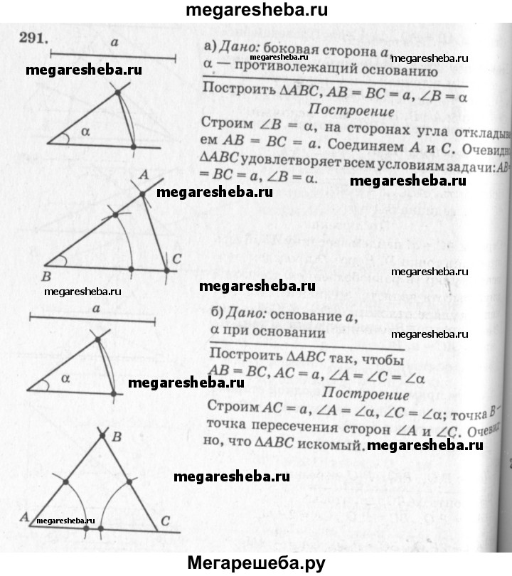 291 Постройте равнобедренный треугольник: а) по боковой стороне и углу, противолежащему основанию; б) по основанию и углу при основании; в) по боковой стороне и углу при основании; г) по основанию и боковой стороне; д) по основанию и медиане, проведённой к основанию.