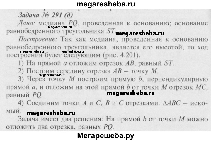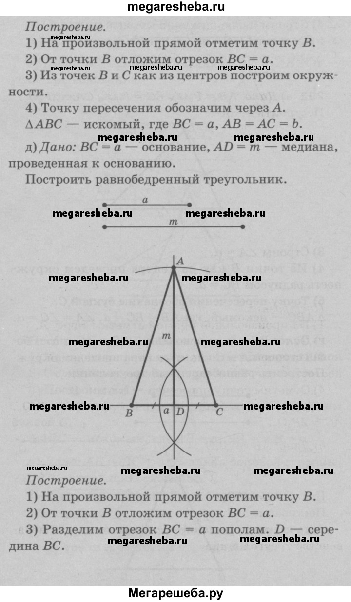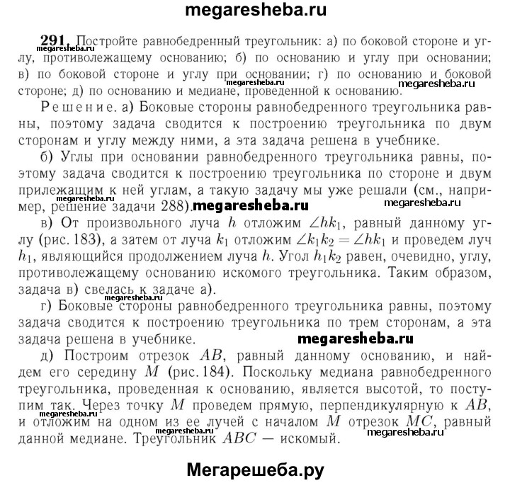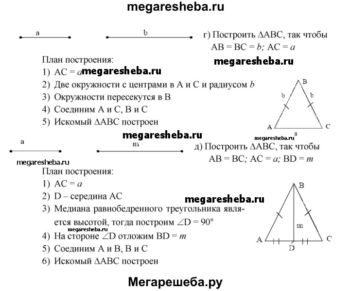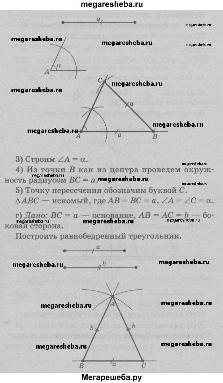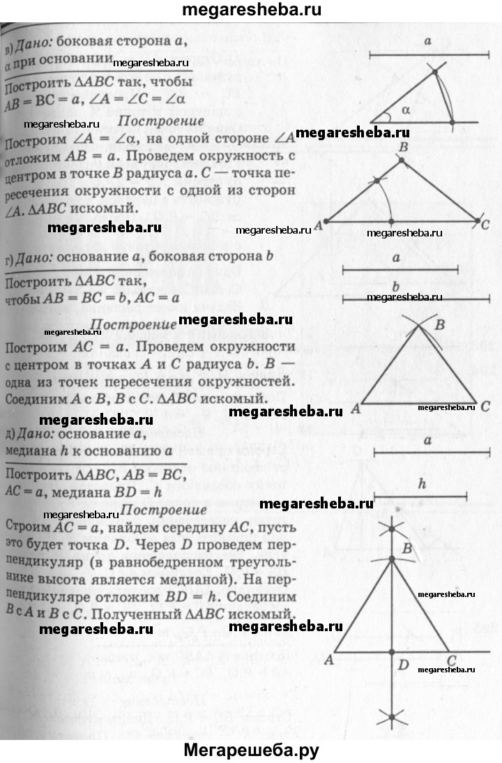 291 Постройте равнобедренный треугольник: а) по боковой стороне и углу, противолежащему основанию; б) по основанию и углу при основании; в) по боковой стороне и углу при основании; г) по основанию и боковой стороне; д) по основанию и медиане, проведённой к основанию.
