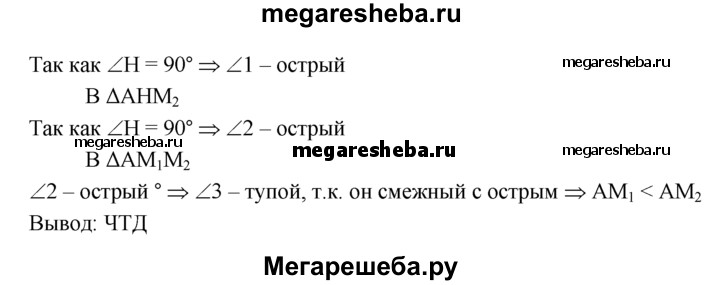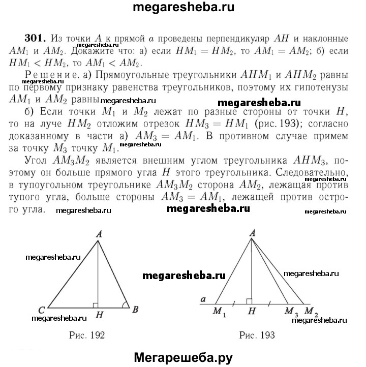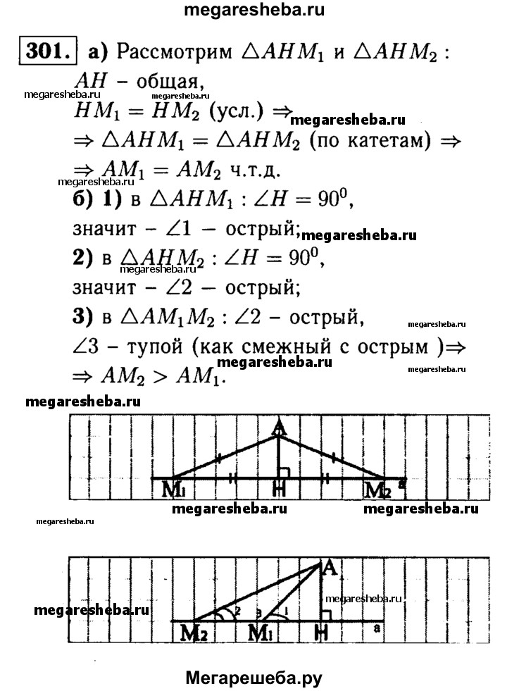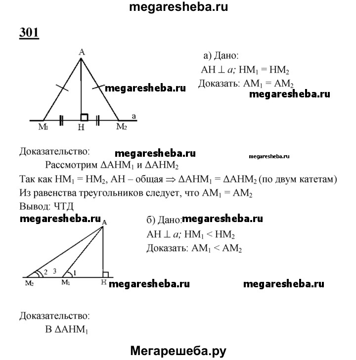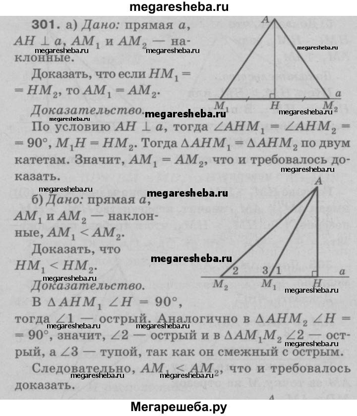 301 Из точки А к прямой а проведены перпендикуляр АН и наклонные АМХ и АМ2. Докажите, что: а) если НМХ = НМ2, то АМХ = АМ2; б) если НМХ<НМ2, то АМХ< АМ2.