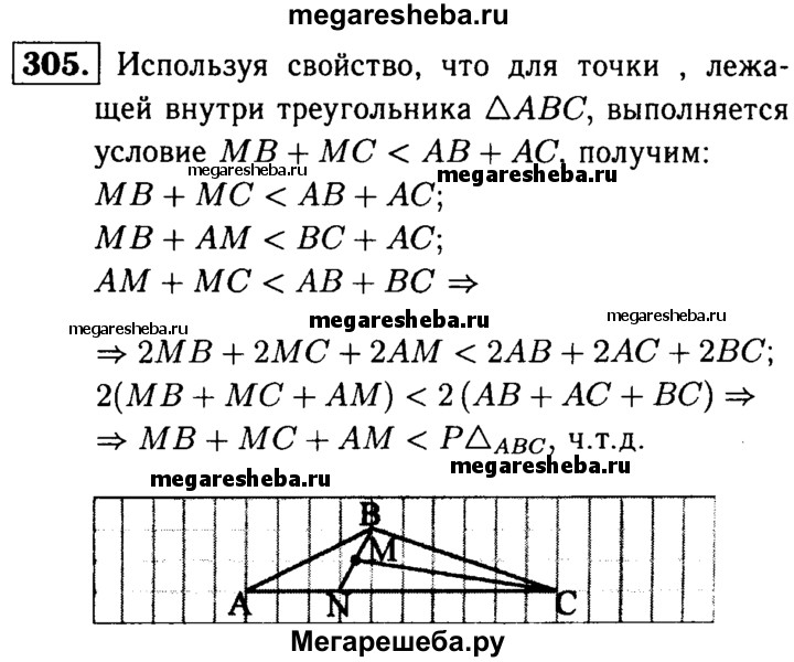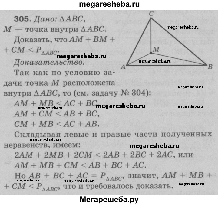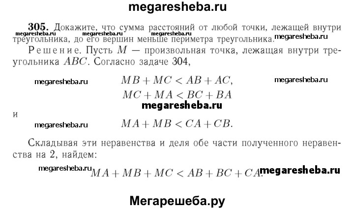 305 Докажите, что сумма расстояний от любой точки, лежащей внутри треугольника, до его вершин меньше периметра треугольника.