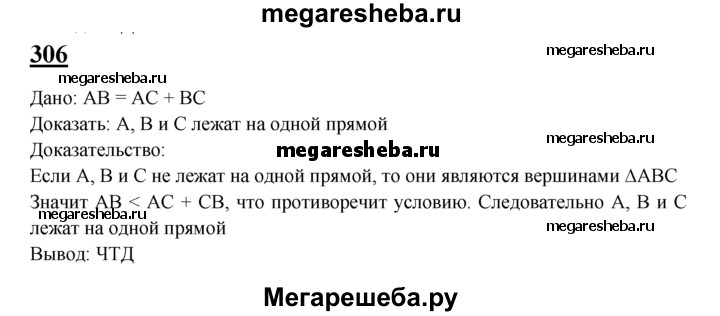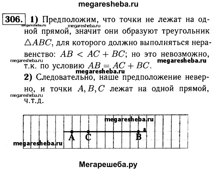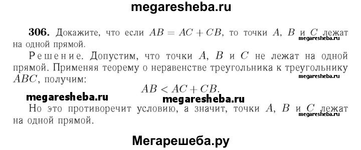 306 Докажите, что если АВ = АС + СВ, то точки А, В и С лежат на одной прямой.