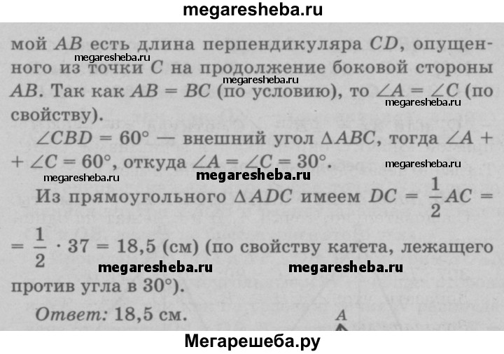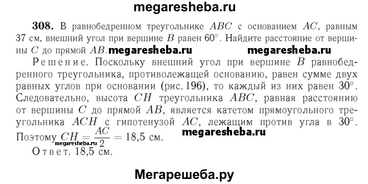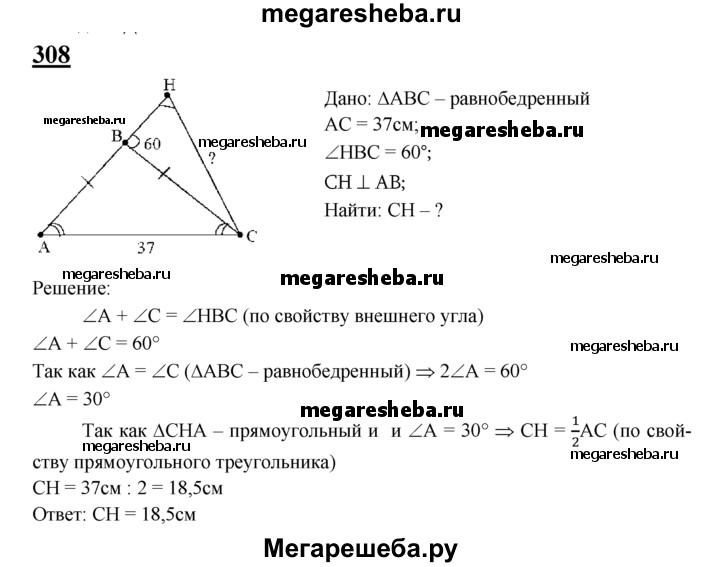 308 В равнобедренном треугольнике ABC с основанием АС, равным 37 см, внешний угол при вершине В равен 60°. Найдите расстояние от вершины С до прямой АВ.