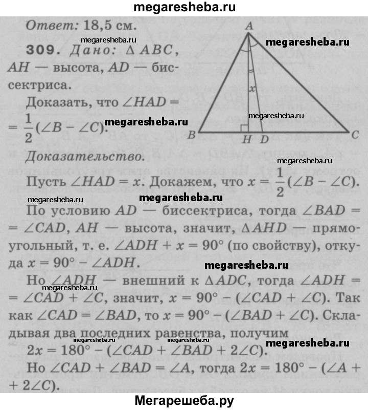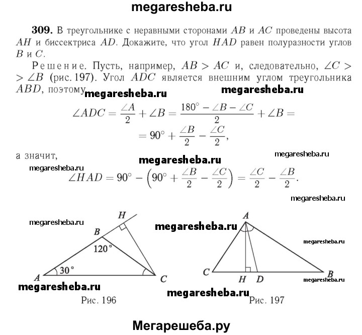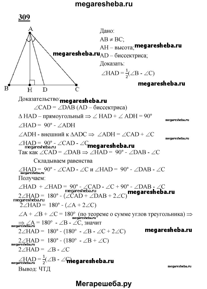309 В треугольнике с неравными сторонами АВ и АС проведены высота АН и биссектриса AD. Докажите, что угол HAD равен полуразности углов В и С.