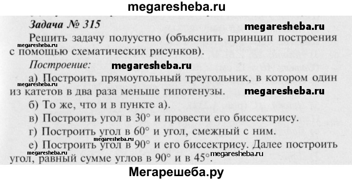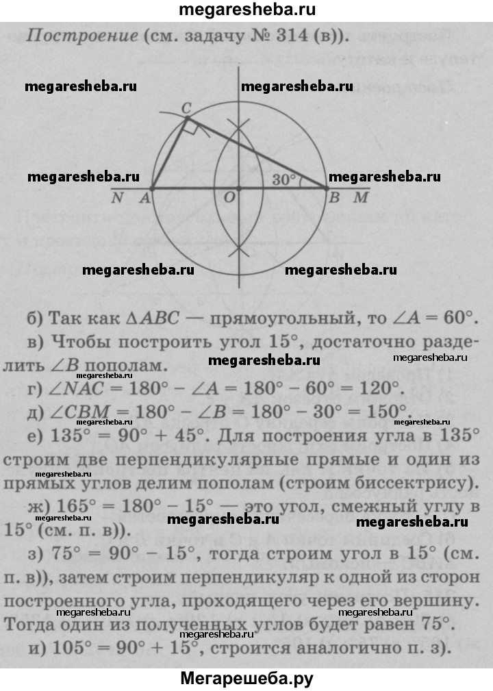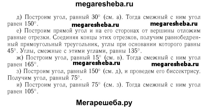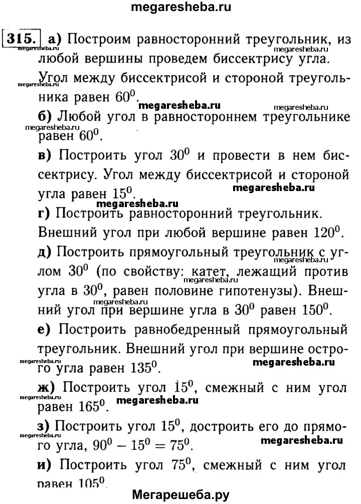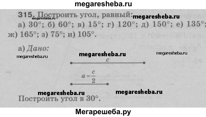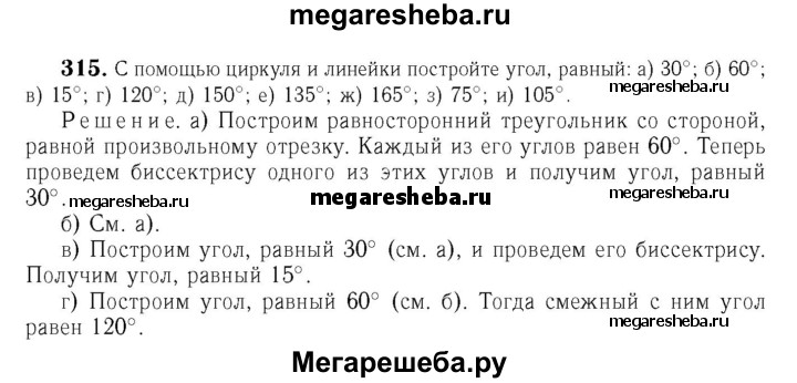 315 С помощью циркуля и линейки постройте угол, равный: а) 30°; б) 60°; в) 15°; г) 120°; д) 150°; е) 135°; ж) 165°; з) 75°; и) 105°.