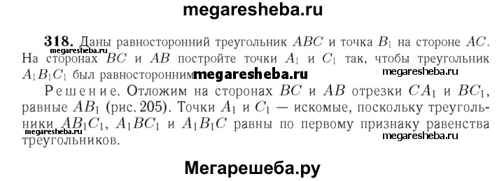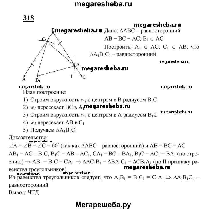 318 Дан равносторонний треугольник ABC и точка Вх на стороне АС. На сторонах ВС и АВ постройте точки А1 и С1 так, чтобы треугольник А1В1С1 был равносторонним.