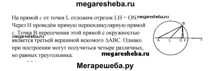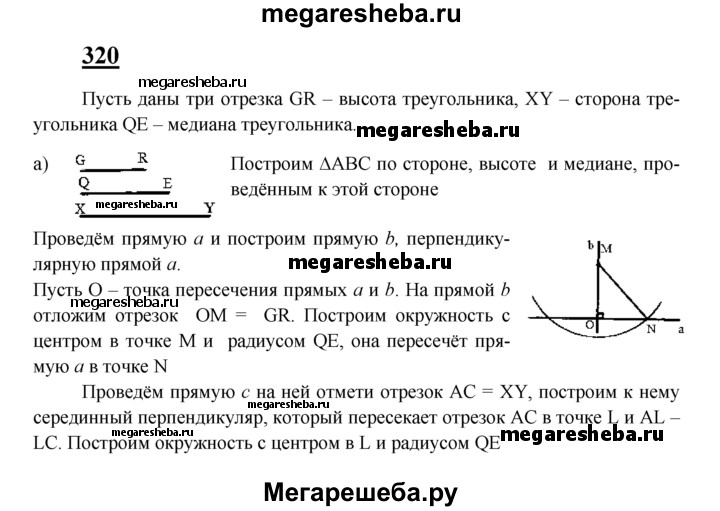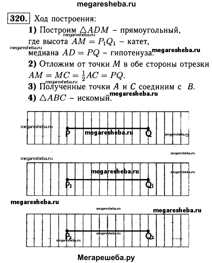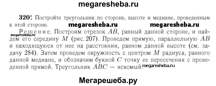 320* Постройте треугольник по стороне, высоте и медиане, проведённым к этой стороне.