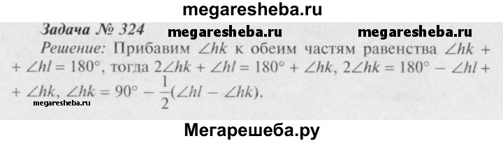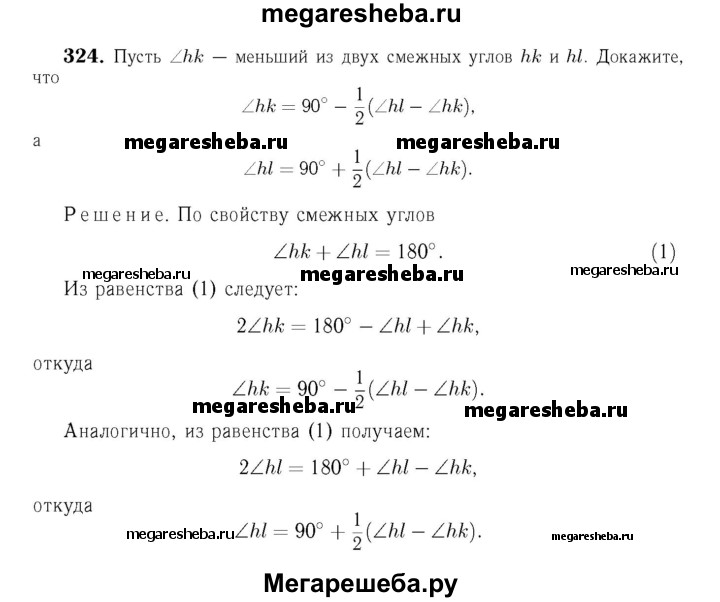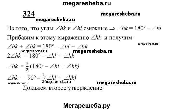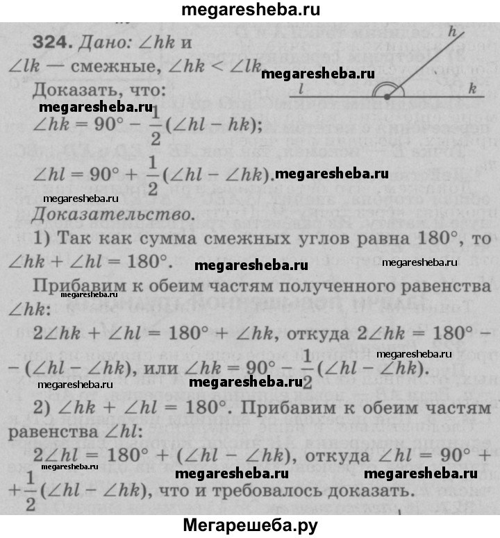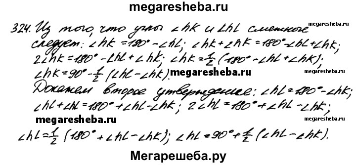 324 Пусть ∠hk — меньший из двух смежных углов hk и hi. Докажите, что ∠hk = 90° - \(∠hl - ∠hk), ∠hl = 90° + 7,( ∠hl - ∠hk).