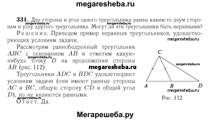 331 Две стороны и угол одного треугольника равны каким-то двум сторонам и углу другого треугольника. Могут ли эти треугольники быть неравными?