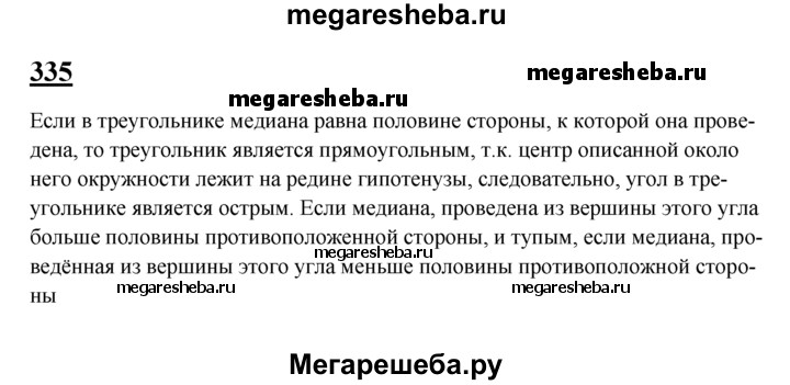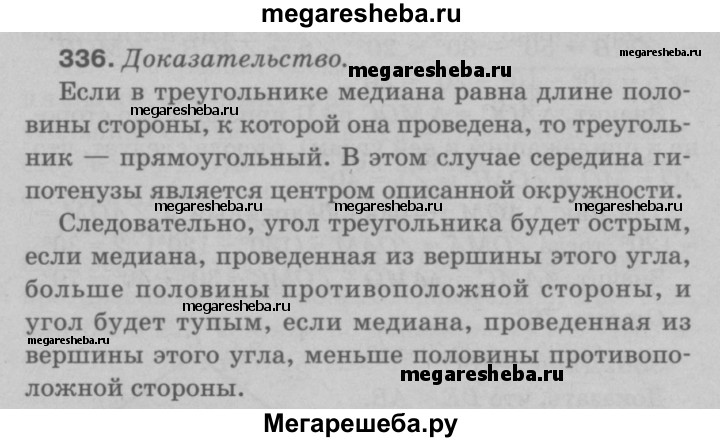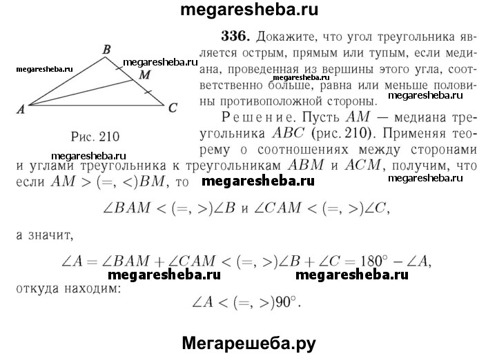 336 Докажите, что угол треугольника является острым, прямым или тупым, если медиана, проведённая из вершины этого угла, соответственно больше, равна или меньше половины противоположной стороны.