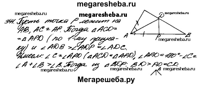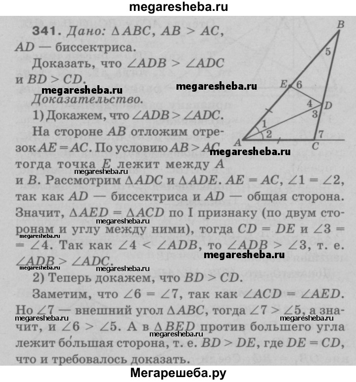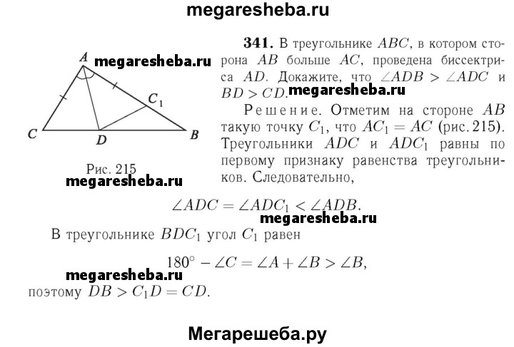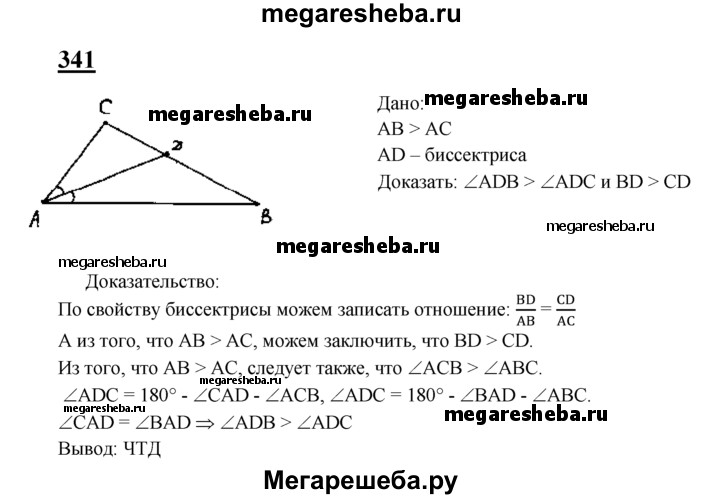 341 В треугольнике ABC сторона АВ больше стороны АС, отрезок AD — биссектриса. Докажите, что ∠ADB > ∠ADC и BD > CD.