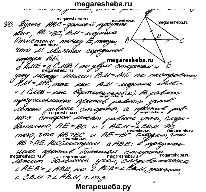 343 Две стороны треугольника не равны друг другу. Докажите, что медиана, проведённая из их общей вершины, составляет с меньшей из сторон больший угол.