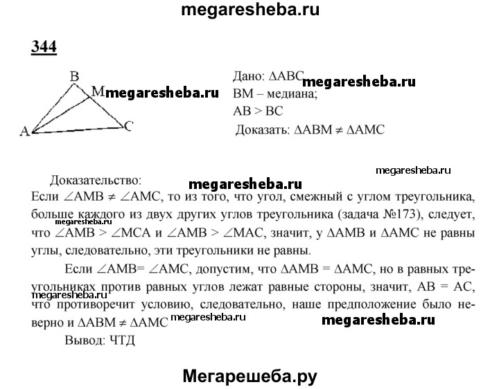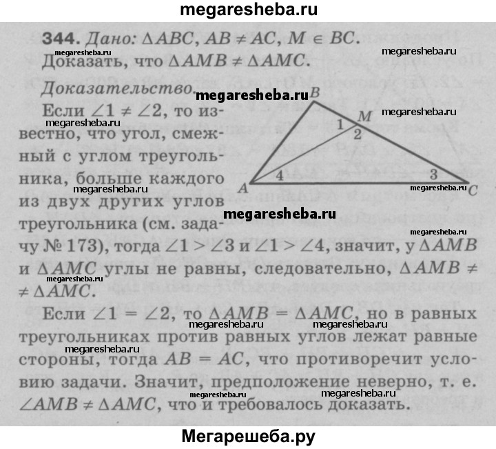 344 В треугольнике ABC стороны АВ и АС не равны, отрезок AM соединяет вершину А с произвольной точкой М стороны ВС. Докажите, что треугольники АМВ и АМС не равны друг другу.