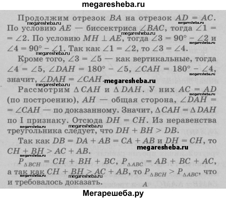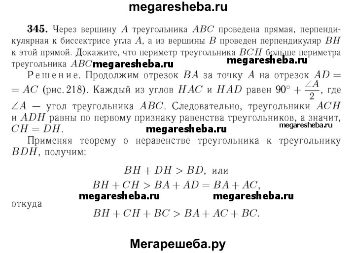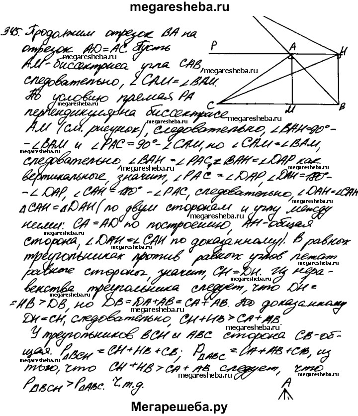 345 Через вершину А треугольника ABC проведена прямая, перпендикулярная к биссектрисе угла Л, а из вершины В проведён перпендикуляр ВН к этой прямой. Докажите, что периметр треугольника ВСН больше периметра треугольника ABC.