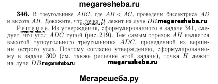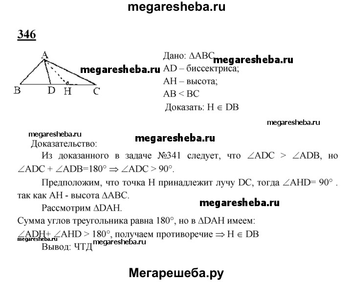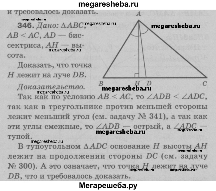 346 В треугольнике ABC, где АВ < АС, отрезок AD — биссектриса, отрезок АН — высота. Докажите, что точка Н лежит на луче DB.