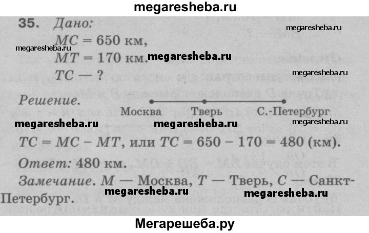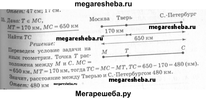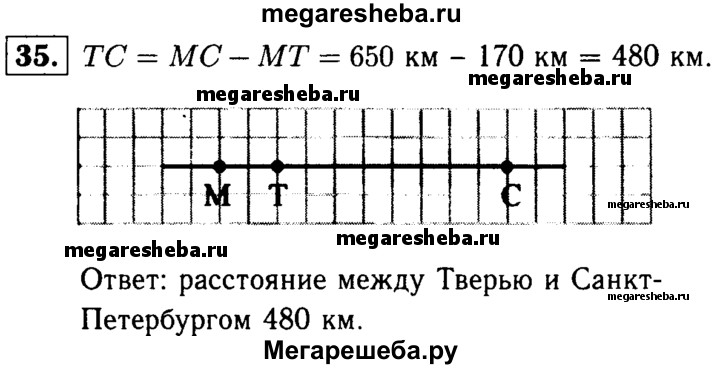 35 Расстояние между Москвой и С.-Петербургом равно 650 км. Город Тверь находится между Москвой и С.-Петербургом в 170 км от Москвы. Найдите расстояние между Тверью и С.-Петербургом, считая, что все три города расположены на одной прямой.