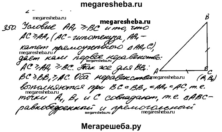 350 В треугольнике ABC высота АА1 не меньше стороны ВС, а высота ВВХ не меньше стороны АС. Докажите, что треугольник ABC — равнобедренный и прямоугольный.