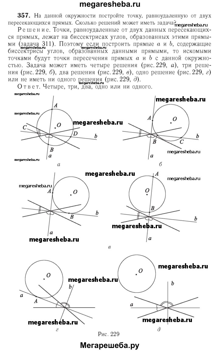 357 На данной окружности постройте точку, равноудалённую от двух данных пересекающихся прямых. Сколько решений может иметь задача?