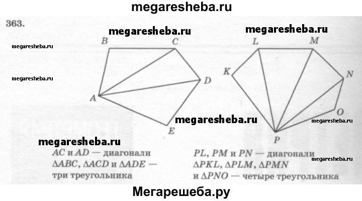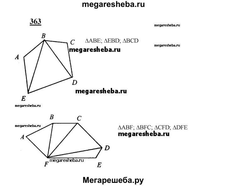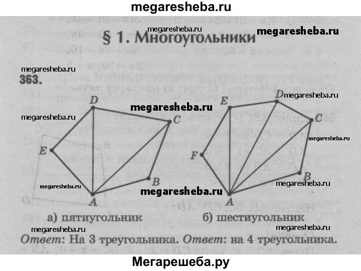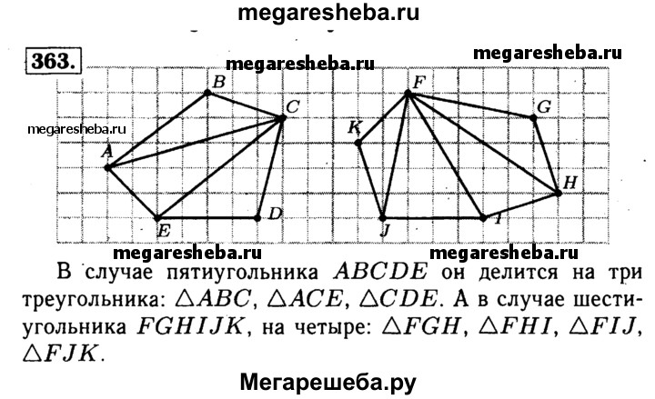 363 Начертите выпуклые пятиугольник и шестиугольник. В каждом многоугольнике из какой-нибудь вершины проведите все диагонали. На сколько треугольников разделяют проведённые диагонали каждый многоугольник?
