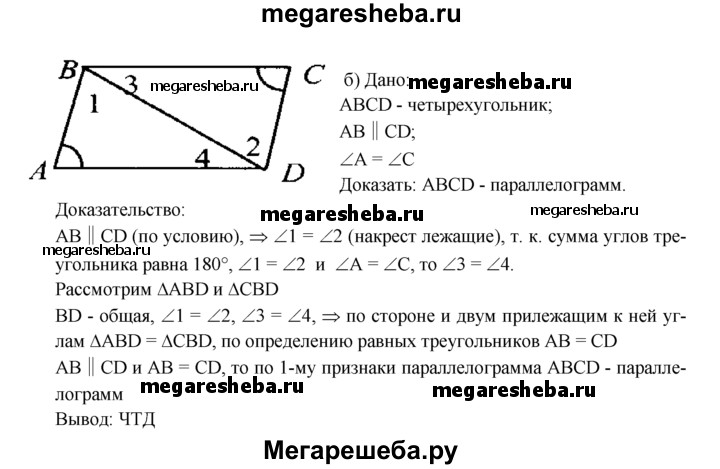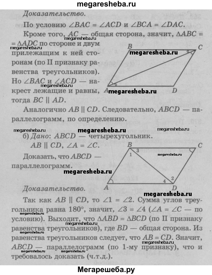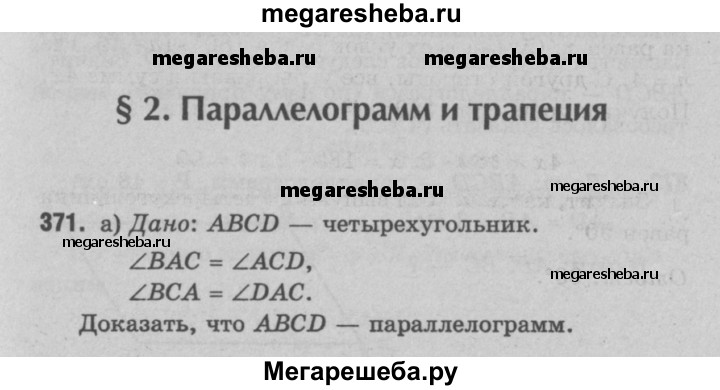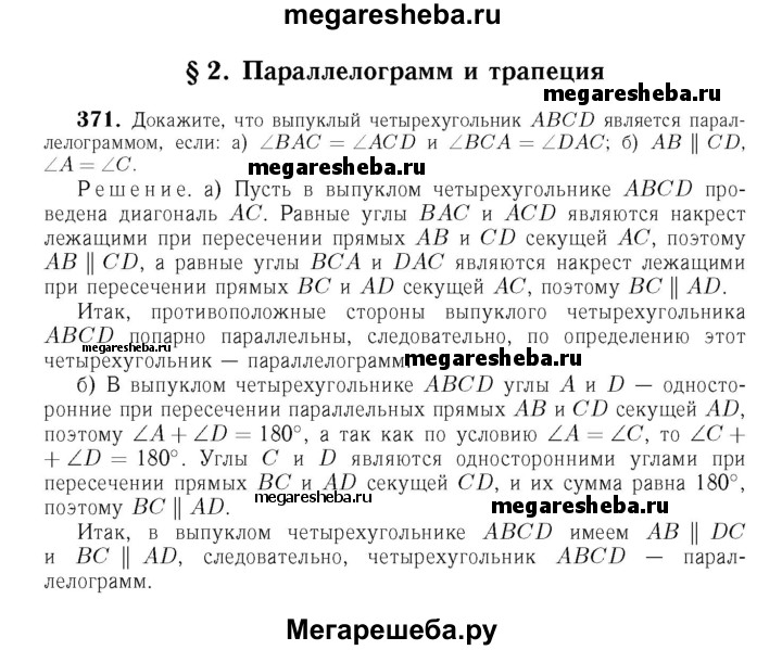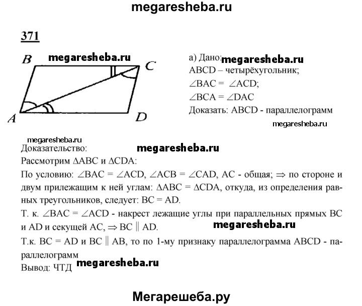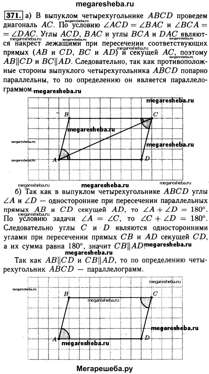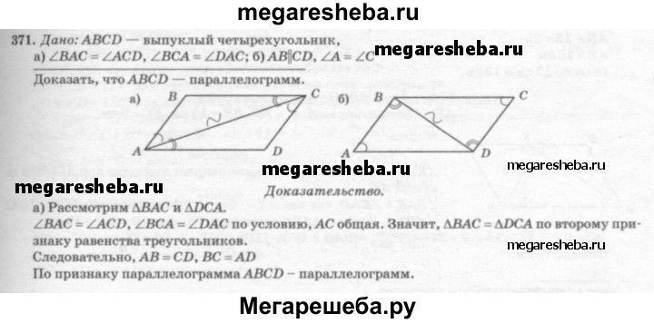 371 Докажите, что выпуклый четырёхугольник ABCD является параллелограммом, если: a) ∠BAC=∠ACD и ∠BCA = ∠DAC; б) АВ || CD, ∠A = ∠C.