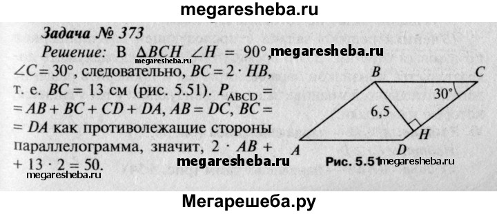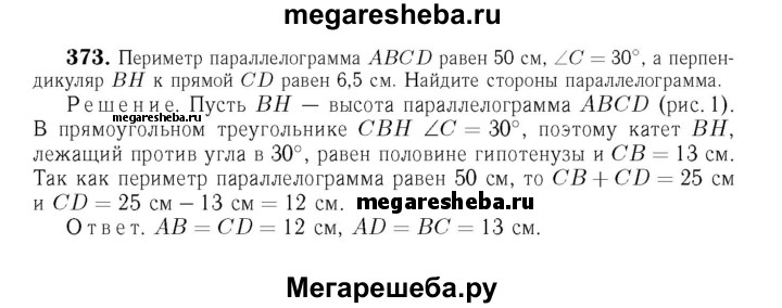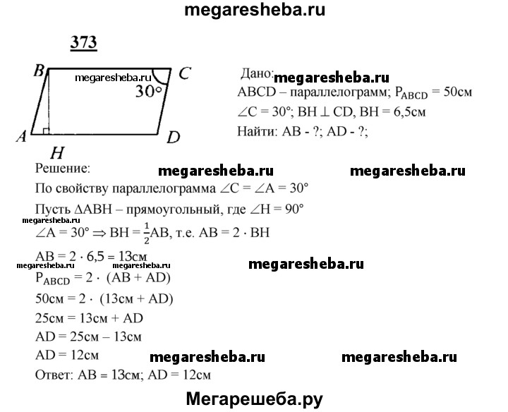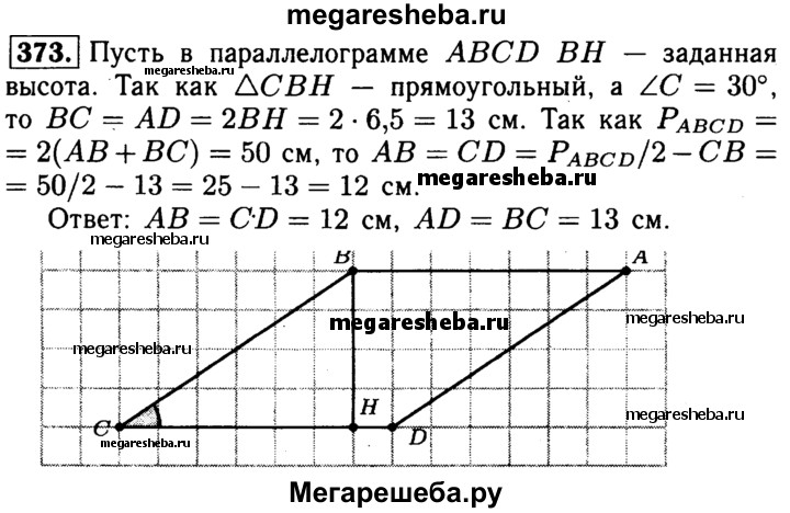 373 Периметр параллелограмма ABCD равен 50 см, ∠C = 30°, а перпендикуляр ВН к прямой CD равен 6,5 см. Найдите стороны параллелограмма.