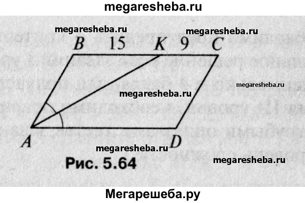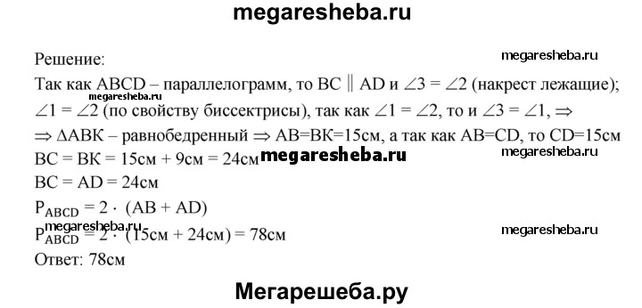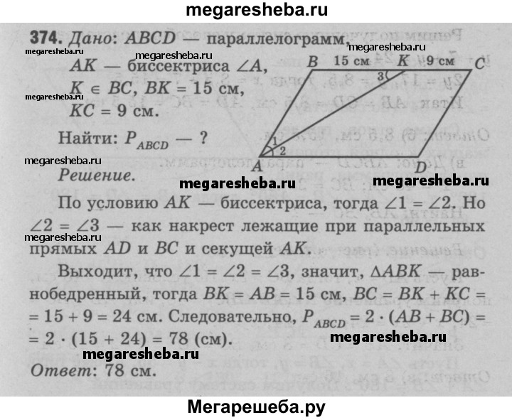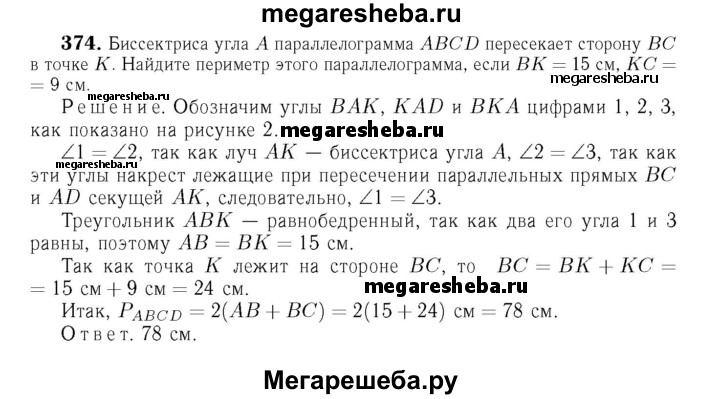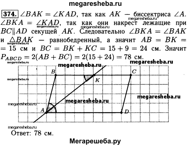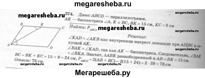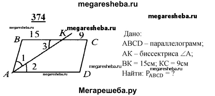 374 Биссектриса угла А параллелограмма ABCD пересекает сторону ВС в точке К. Найдите периметр этого параллелограмма, если ВК = 15 см, КС = 9 см.