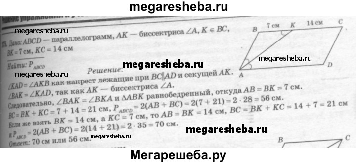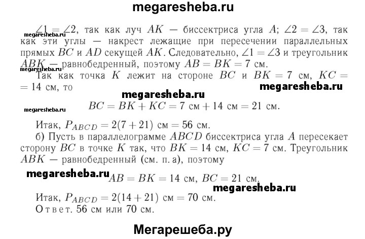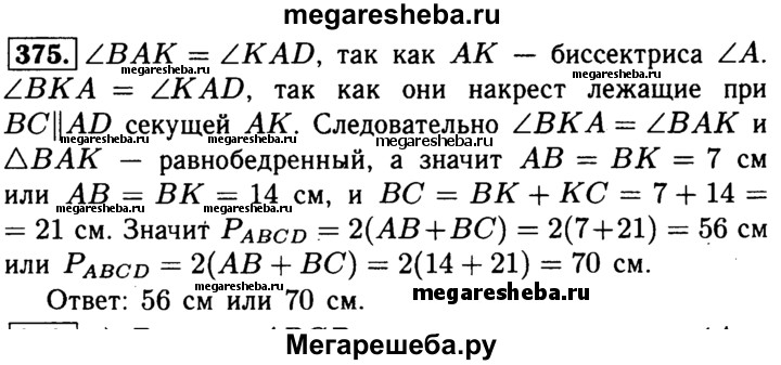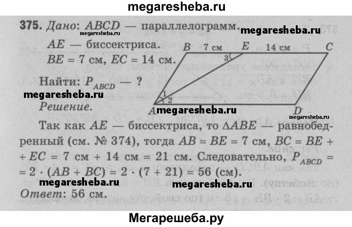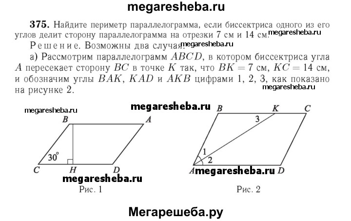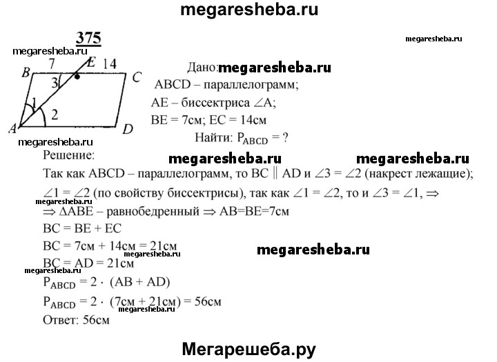 375 Найдите периметр параллелограмма, если биссектриса одного из его углов делит сторону параллелограмма на отрезки 7 см и 14 см.