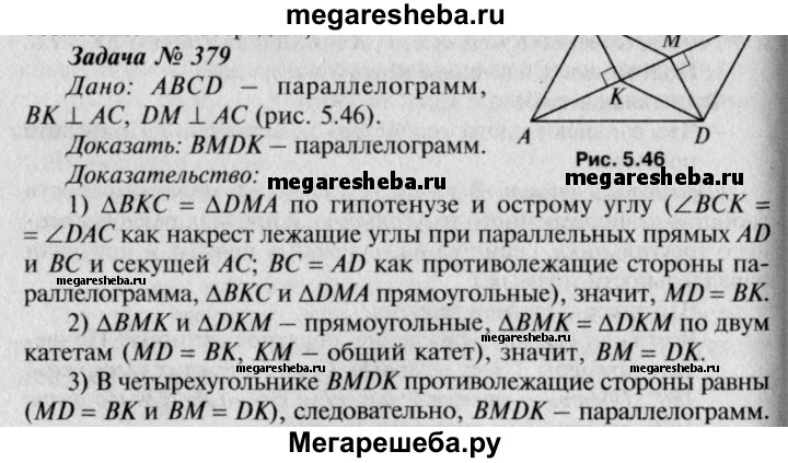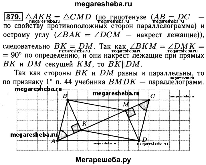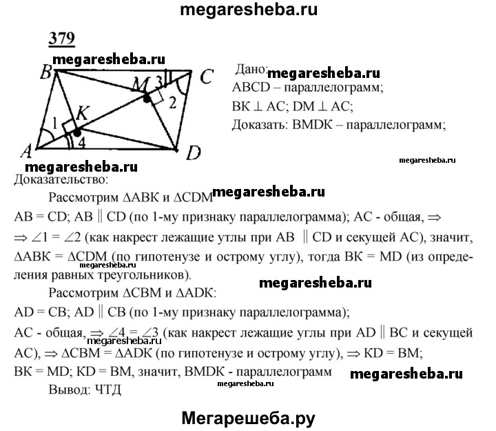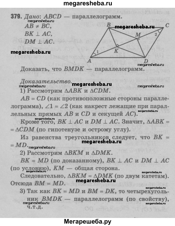379 Из вершин В и D параллелограмма ABCD, у которого АВ≠ВС и угол А острый, проведены перпендикуляры ВК и DM к прямой АС. Докажите, что четырёхугольник BMDK — параллелограмм.