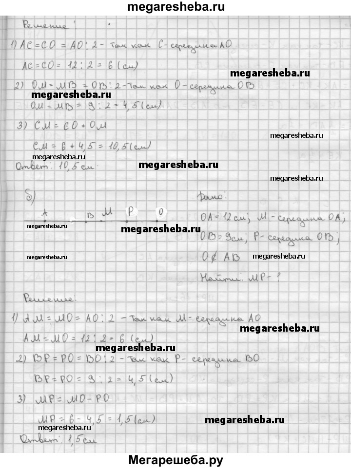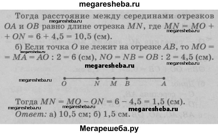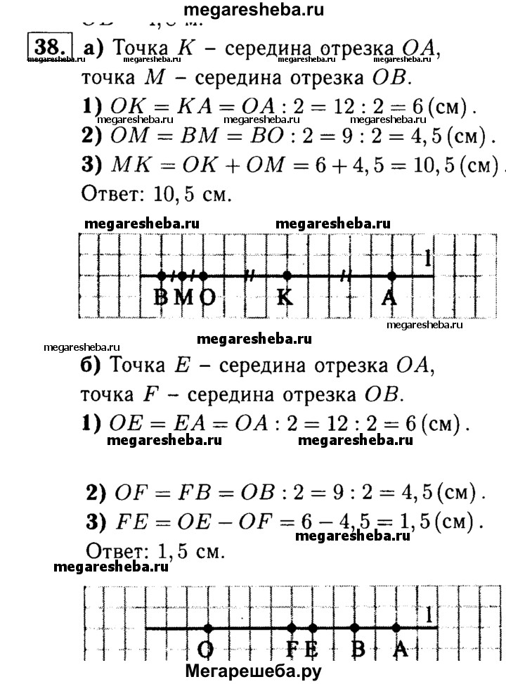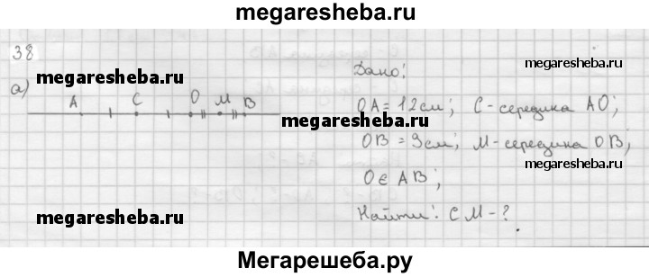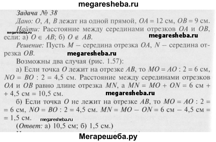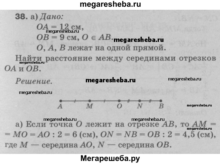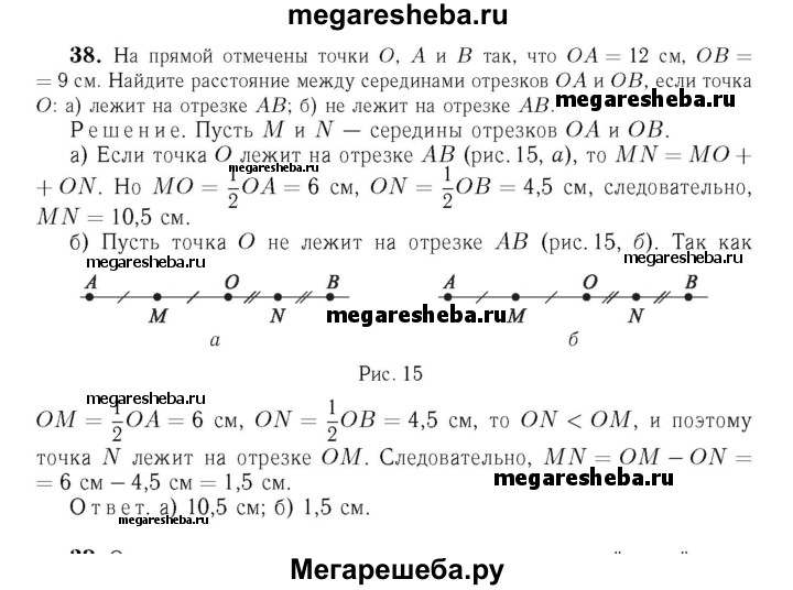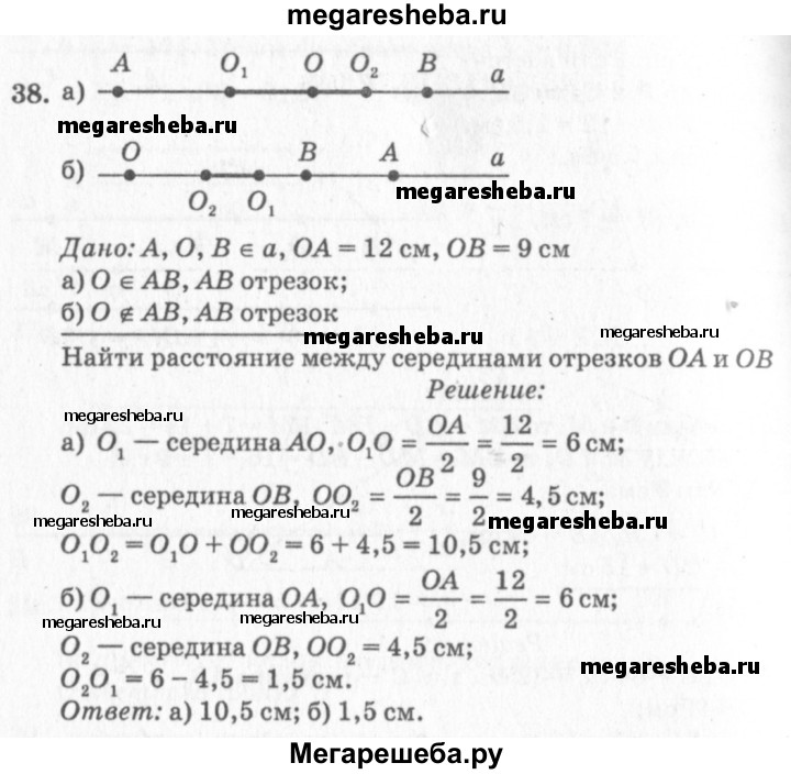 38 На прямой отмечены точки О, А и B так, что OA = 12 см, ОB = 9 см. Найдите расстояние между серединами отрезков OA и ОB, если точка О: а) лежит на отрезке АВ; б) не лежит на отрезке АВ.