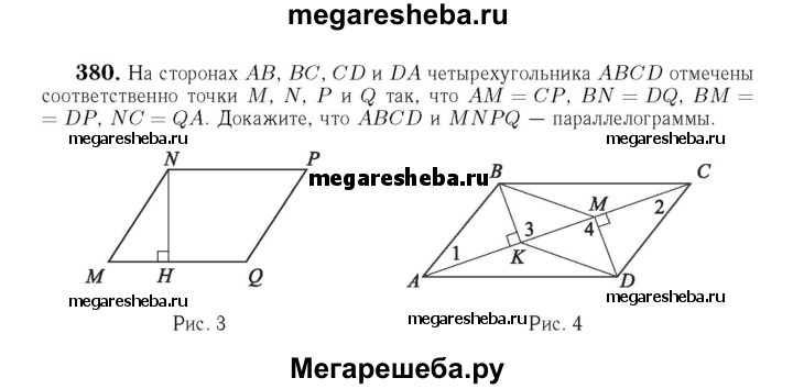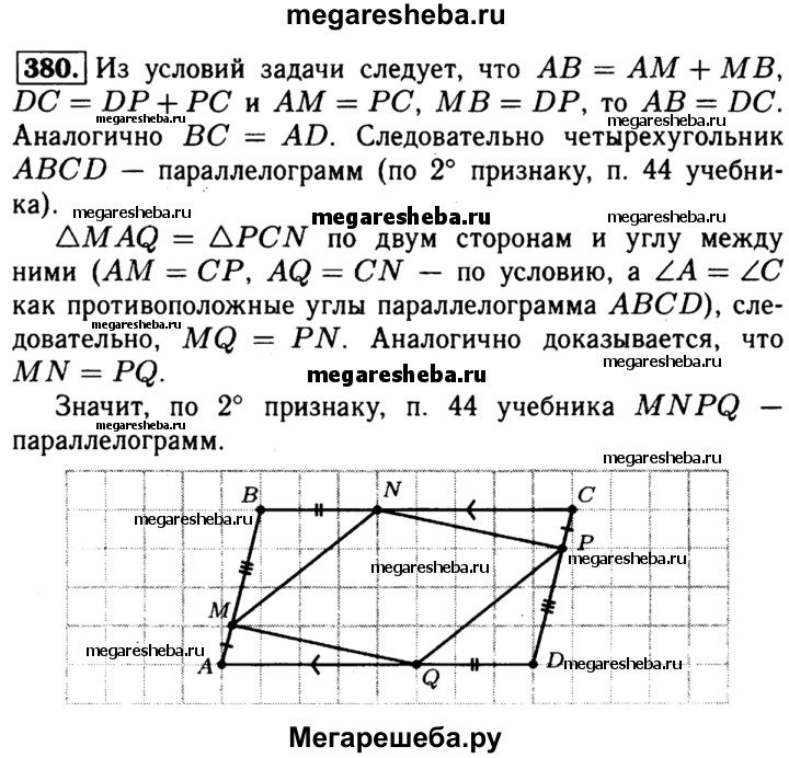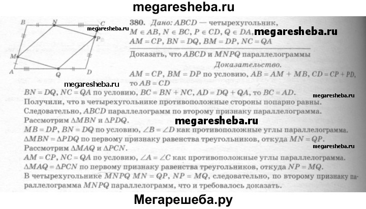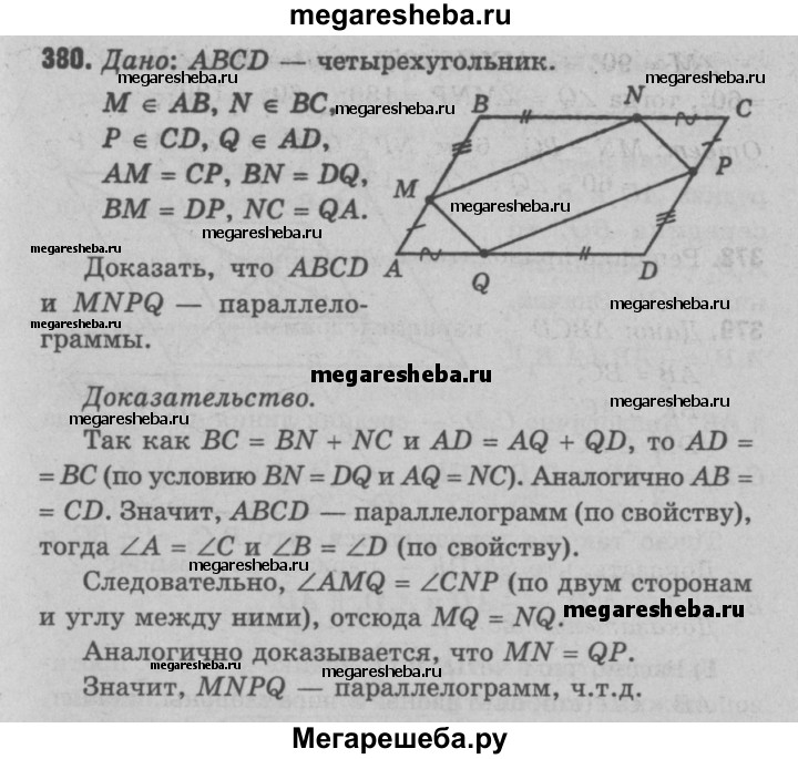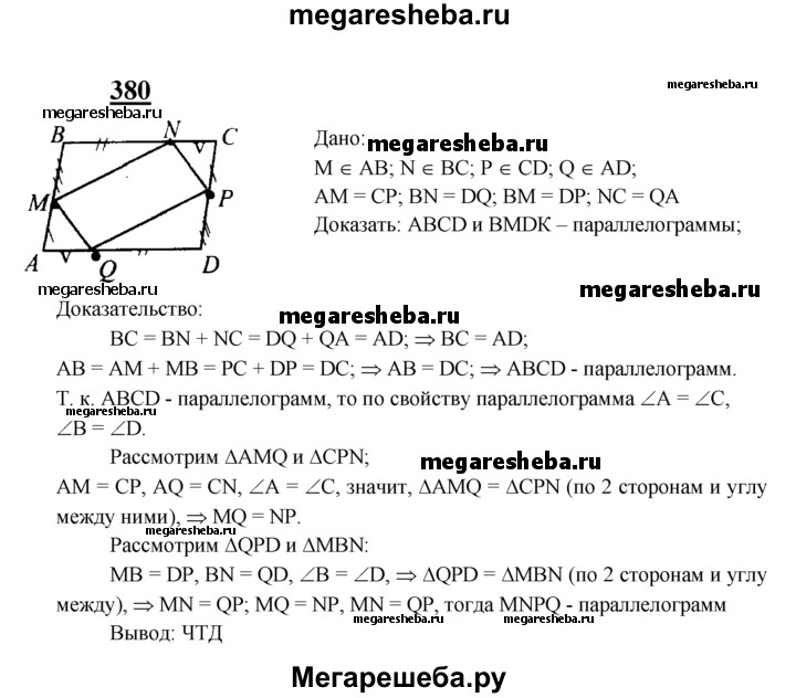 380 На сторонах АВ, ВС, CD и DA четырёхугольника ABCD отмечены соответственно точки М, N, Р и Q так, что АМ = СР, BN = DQ, BM = DP, NC = QA. Докажите, что ABCD и MNPQ — параллелограммы.
