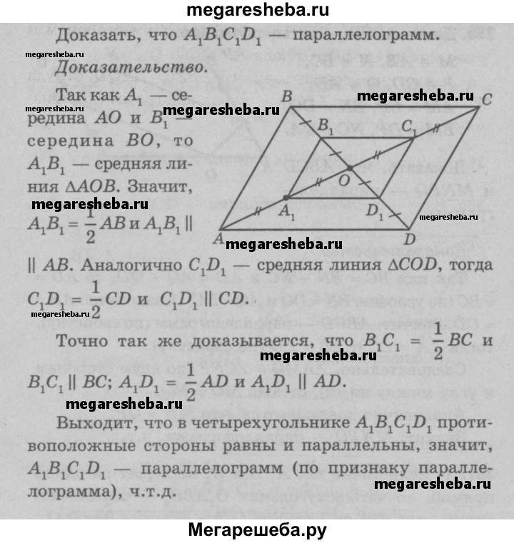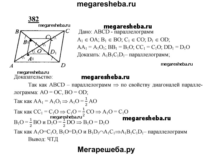 382 Диагонали параллелограмма ABCD пересекаются в точке О. Докажите, что четырёхугольник A1BlClD1, вершинами которого являются середины отрезков OA, ОВ, ОС и OD, — параллелограмм.