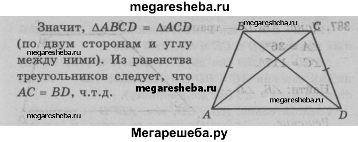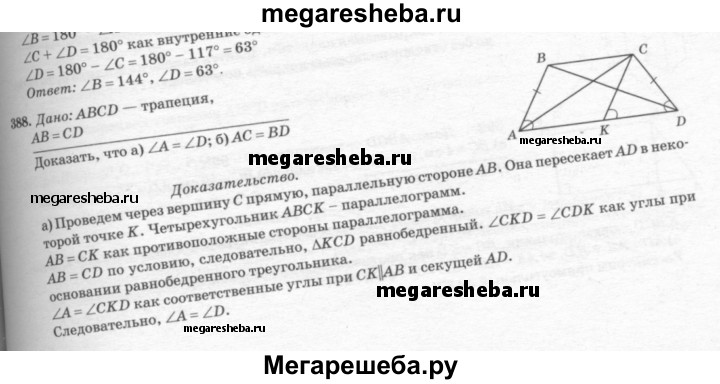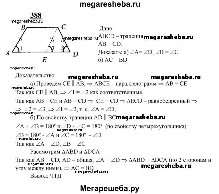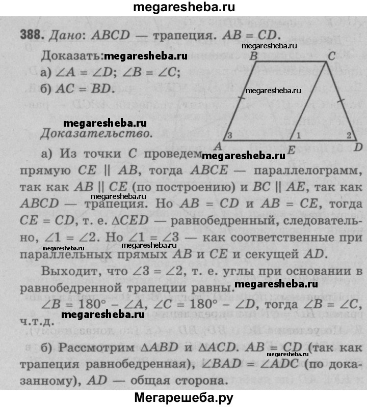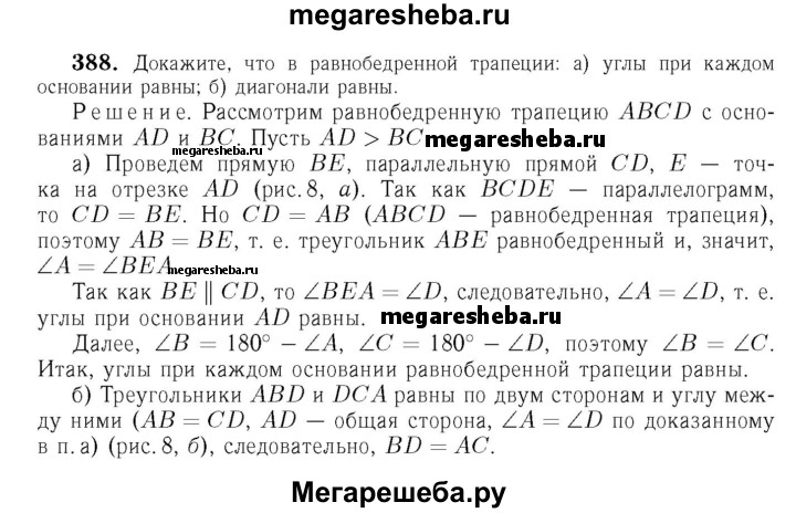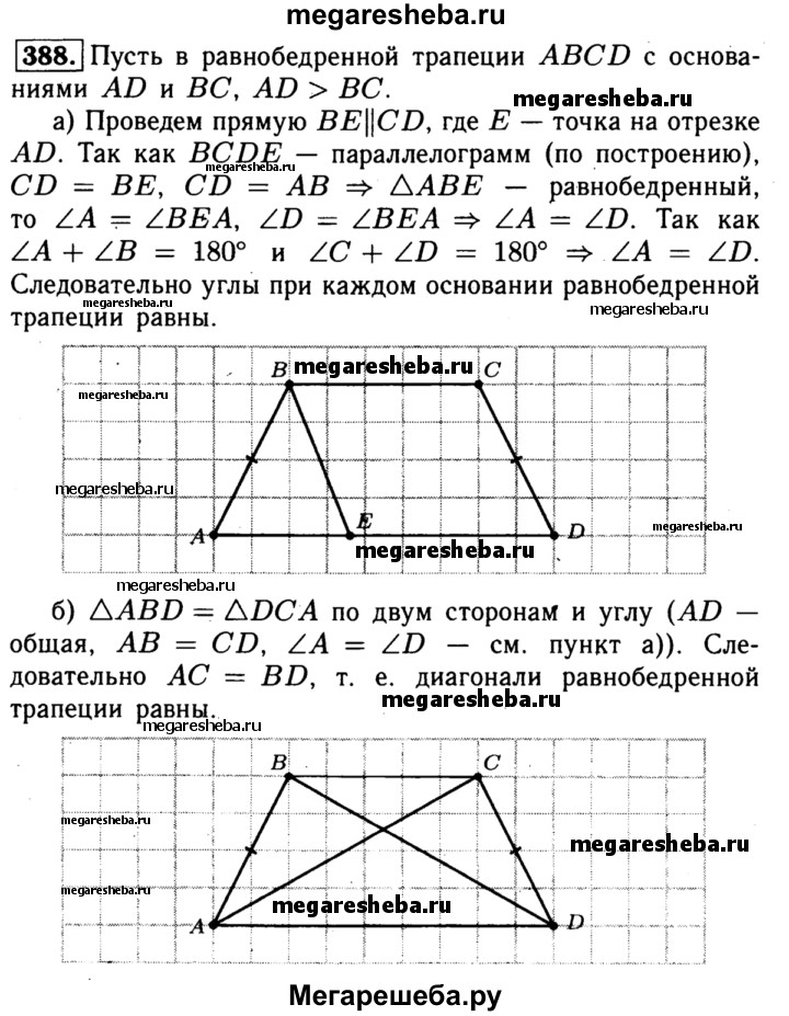 388 Докажите, что в равнобедренной трапеции: а) углы при каждом основании равны; б) диагонали равны.