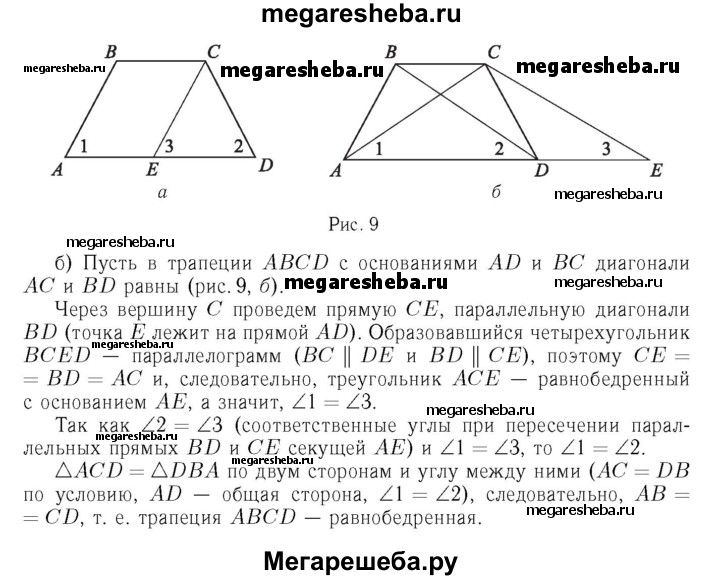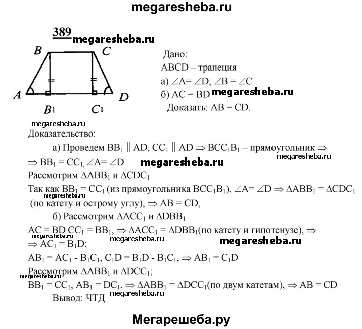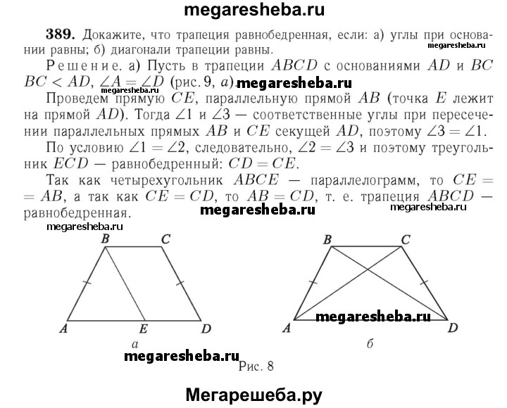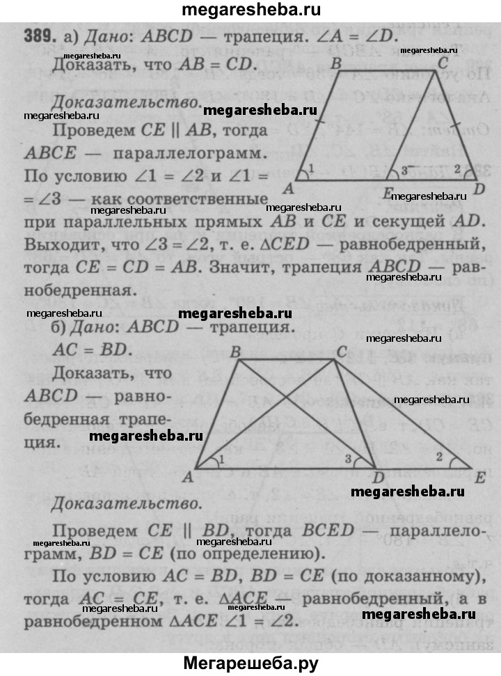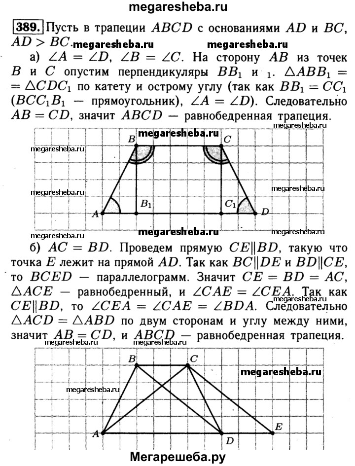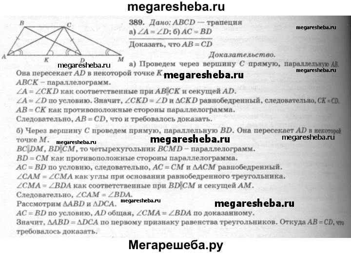 389 Докажите, что трапеция равнобедренная, если: а) углы при основании равны; б) диагонали трапеции равны.