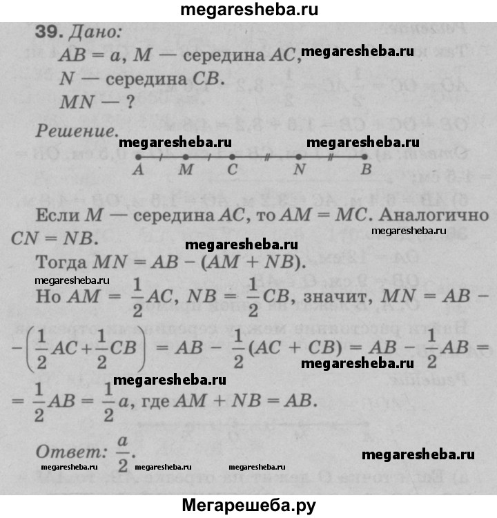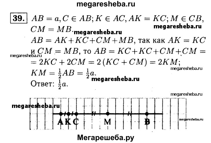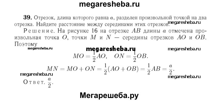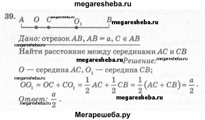 39 Отрезок, длина которого равна а, разделён произвольной точкой на два отрезка. Найдите расстояние между серединами этих отрезков.