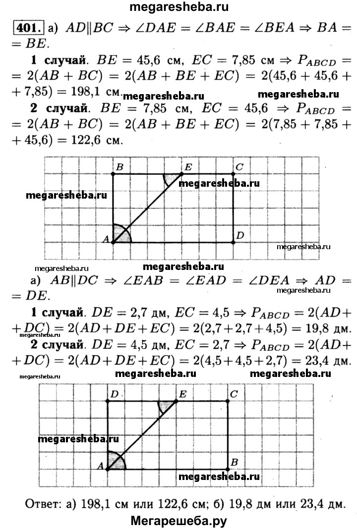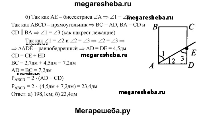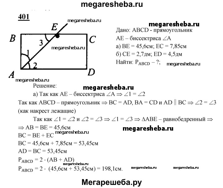 401 Найдите периметр прямоугольника ABCD, если биссектриса угла А делит сторону: а) ВС на отрезки 45,6 см и 7,85 см; б) DC на отрезки 2,7 дм и 4,5 дм.