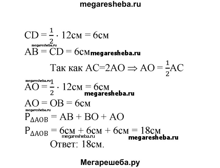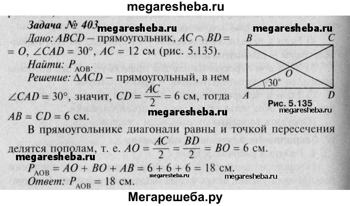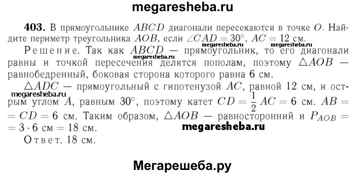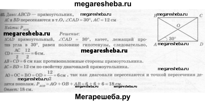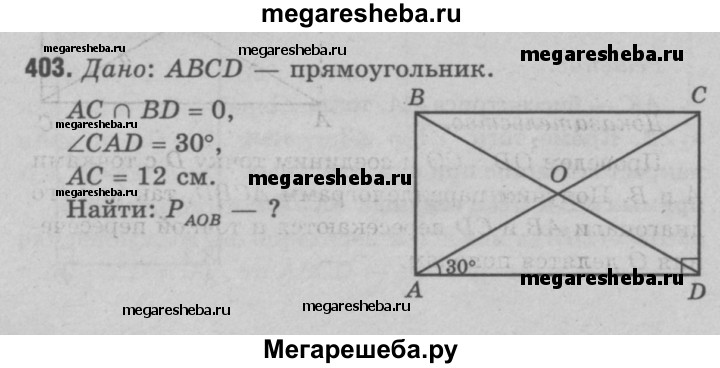 403 В прямоугольнике ABCD диагонали пересекаются в точке О. Найдите периметр треугольника АОВ, если ∠CAD = 30°, АС = 12 см.