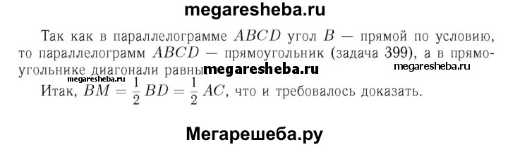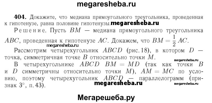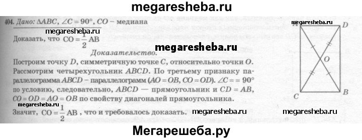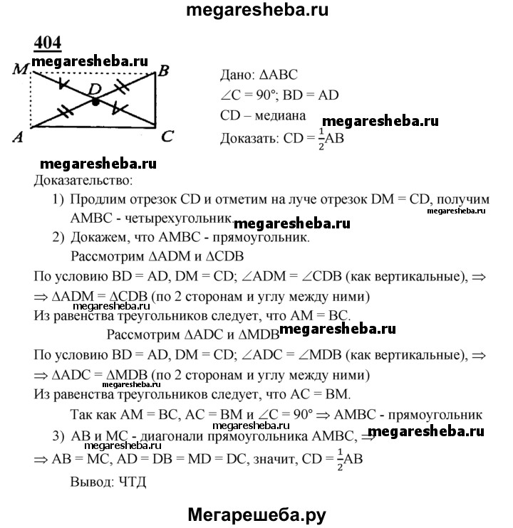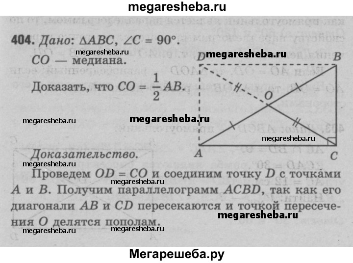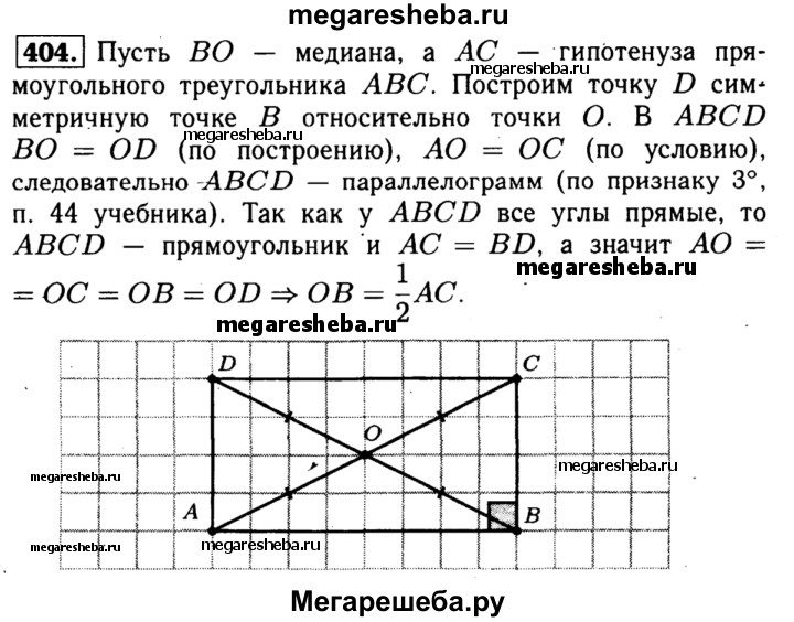 404 Докажите, что медиана прямоугольного треугольника, проведённая к гипотенузе, равна половине гипотенузы.