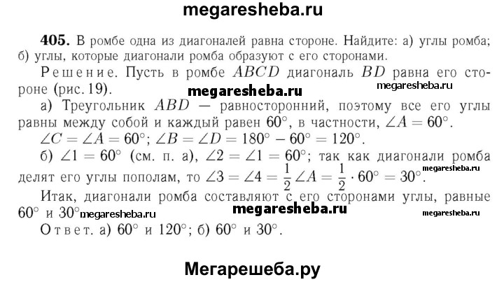 405 В ромбе одна из диагоналей равна стороне. Найдите: а) углы ромба; б) углы, которые диагонали ромба образуют с его сторонами.