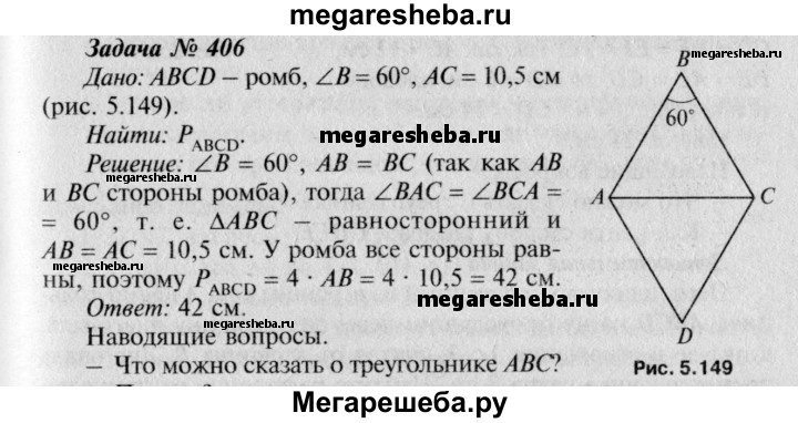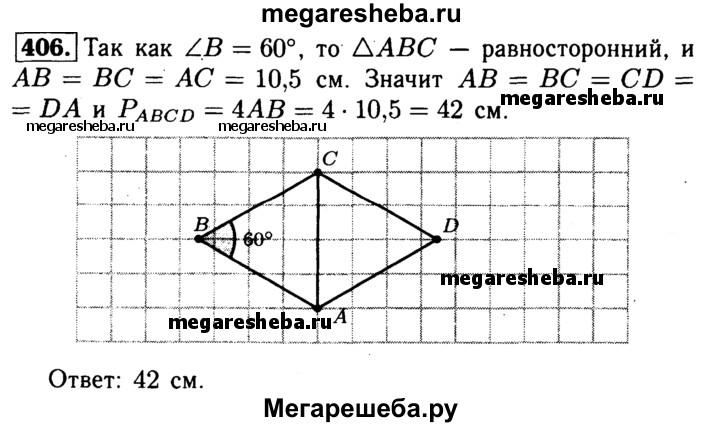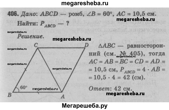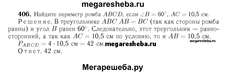 406 Найдите периметр ромба ABCD, в котором ∠B = 60°, АС= 10,5 см.